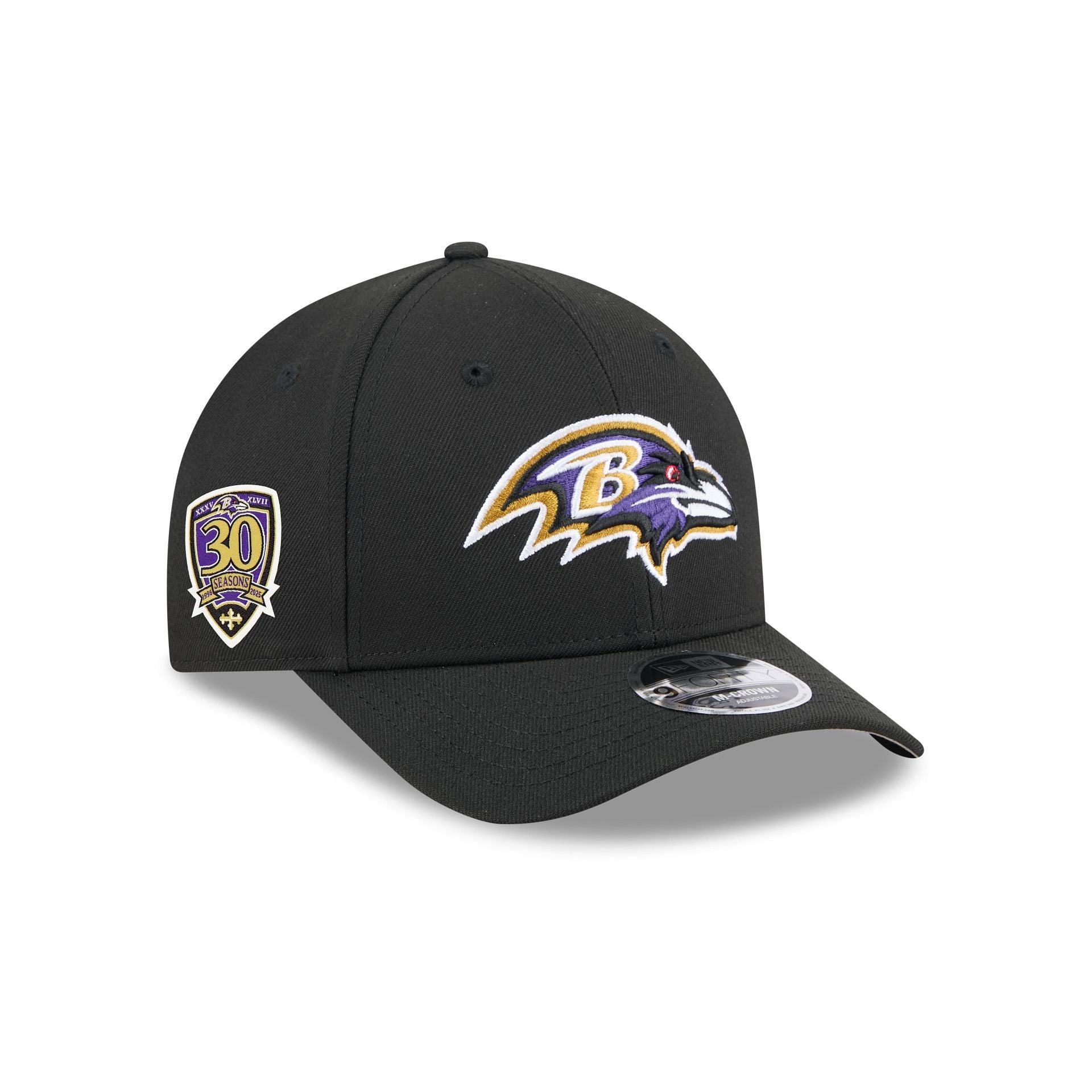 The Baltimore Ravens Team 9FORTY M-Crown Snapback features an embroidered Ravens logo at the front panels with a matching NFL Shield logo above an adjustable snapback closure at the rear and a gray undervisor.