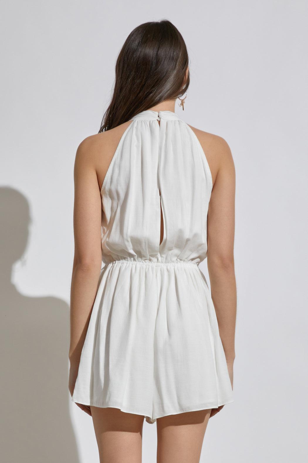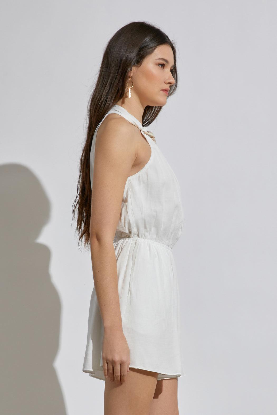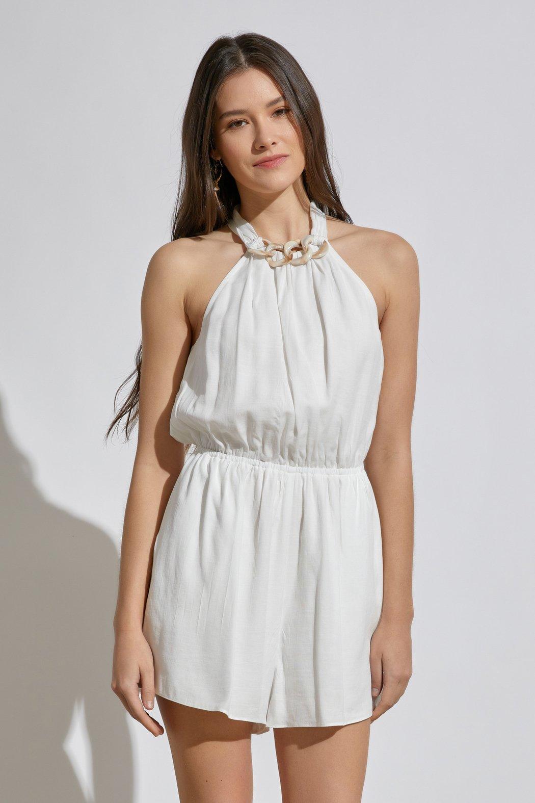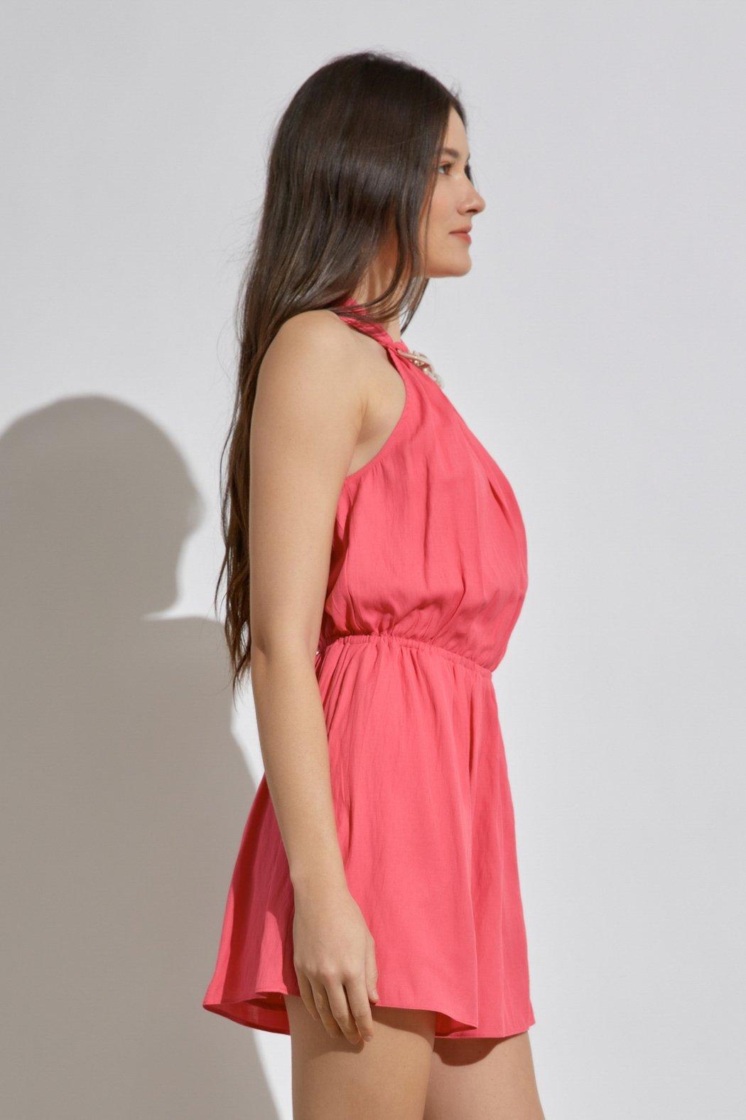 Neck Trim Detail Romper. Colors: Coral Pink & Aqua