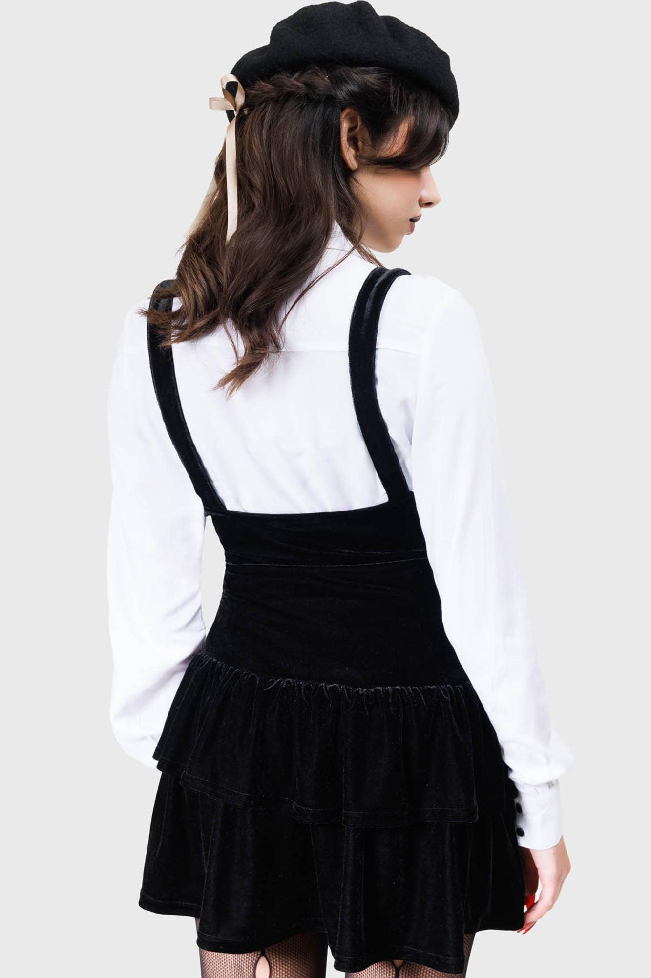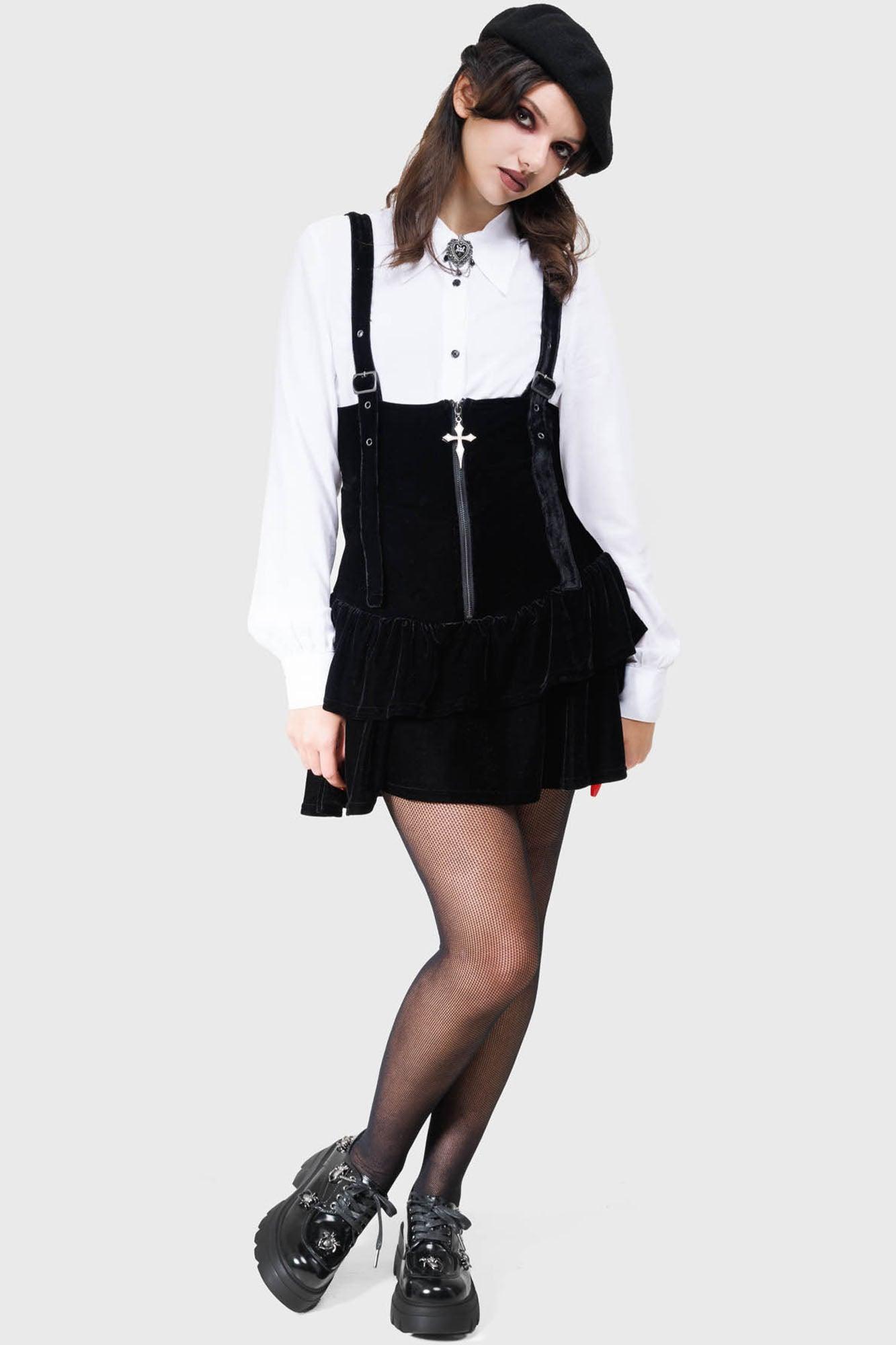 NECROTOME.- Soft, stretch velvet.- Adjustable shoulder straps.- Mini length.- Underbust style.- Layered skirt.- Front zip closure.- Statement cross zip puller.- Fitted.With KILLSTAR branding, 95% Polyester 5% Elastane.Hand wash delicate (30°c) / Do not bleach / Do not tumble dry /Do not iron / Do not dry clean. Imported.