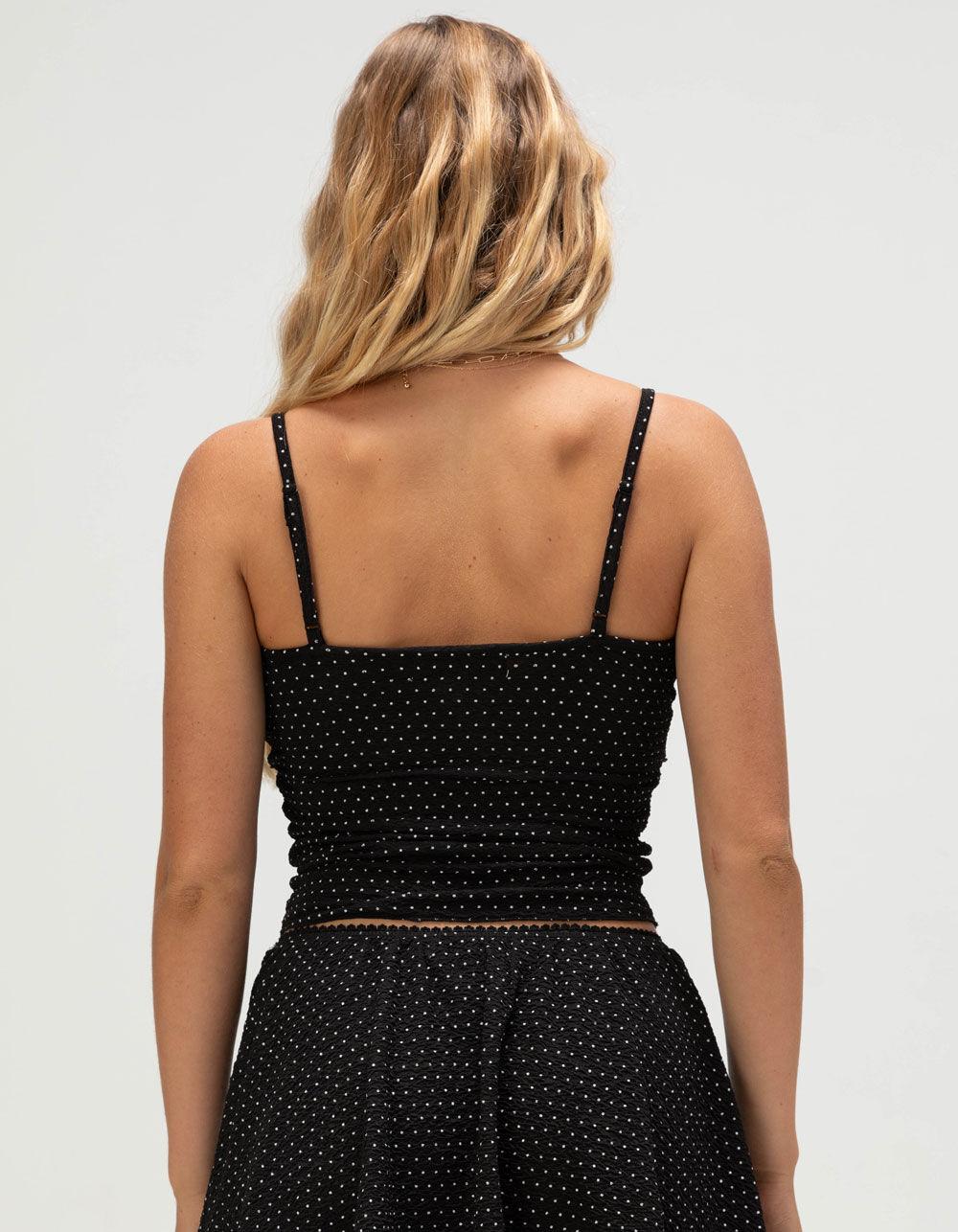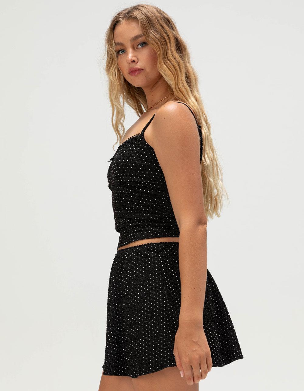 BLK/WHT. Nectar Clothing Polka Dot Cami. The Nectar Clothing Polka Dot Cami is a playful take on a classic feminine staple. Crafted from soft, textured fabric, it features an allover polka dot pattern that adds a fun, retro-inspired vibe. The flattering V-neckline is accented with delicate picot trim and finished with a charming satin bow and tiny floral detail at the center, adding a sweet, romantic touch. Adjustable straps ensure a customizable fit, making this cami perfect for layering or wearing on its own for an effortlessly cute and casual look. 95% Polyester 5% Spandex. Hand wash. Imported.