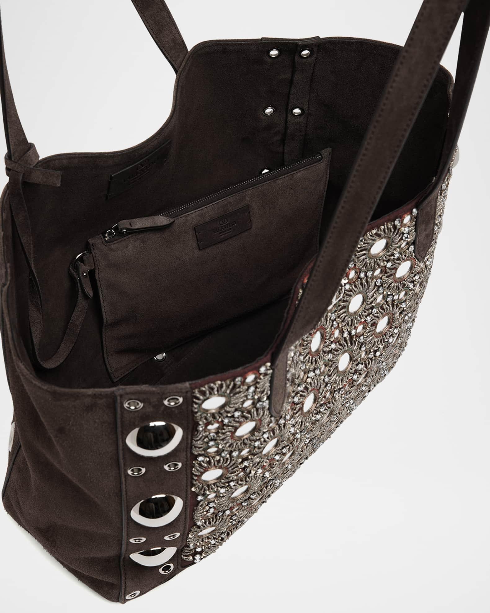Valentino Garavani "Nellcote" mirrored embellished suede tote bag Features signature VLOGO accent Shoulder strap Open top Interior, removable leash zip pouch bag Approx. 11.8"H x 15.7"W x 5.1"D Viscose Made in Italy
