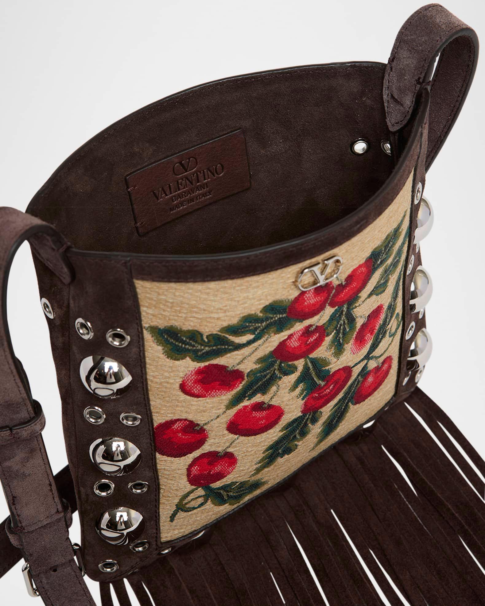 Valentino Garavani "Nellcote" jacquard cherries fabric and suede crossbody bag with studs and fringe trim Features signature VLOGO hardware Adjustable crossbody strap Open top Approx. 7.9"H x 7.9"W x 1.2"D Made in Italy