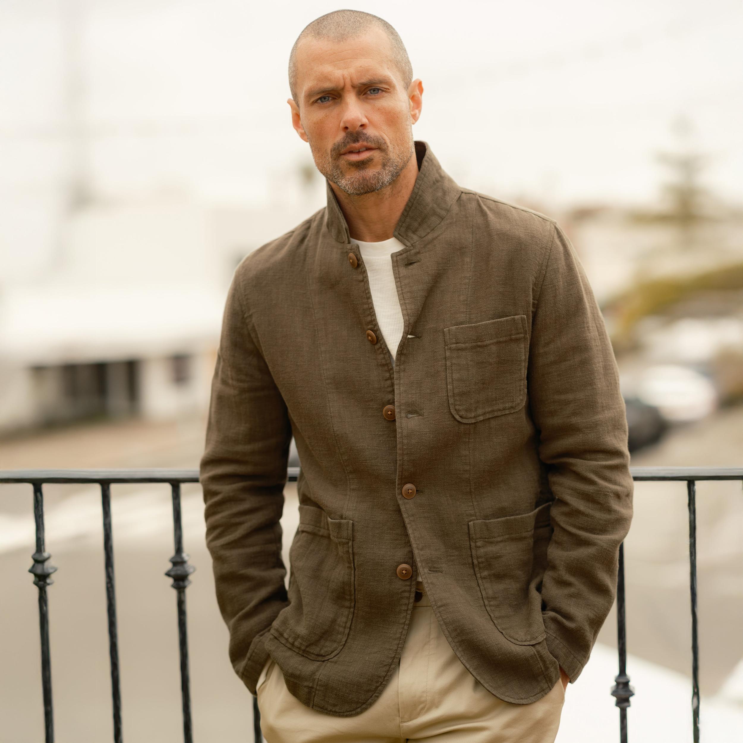 Clean up with the uber cool, timeless stand-up collar. An effortless way to transcend trend. And it’s a best seller for a reason. It’s the James Bond of modern blazers, leaving customers stirred, not shaken. After a sold-out debut last year, we brought the Nelson blazer back this season in a ramie cloth. Ramie, a natural fiber similar to linen, is more durable and breathable than cotton, yet has a refined luster similar to linen. Cut with a sturdy twill weave, unconstructed, with finishing details such as chambray piped seams and a weathered wash, it's the ideal casual blazer. Wear it with denim or dress its up with our Mercer chino and a casual button up shirt. The Model is also wearing: Model: ----Details---- Stand up collar Chambray detailed yoke Chambray piped seams Functioning button-through sleeves Chest patch pocket 2 large patch pockets Weather washed Imported ----Materials---- Body: 100% Ramie Sleeve Lining: 100% Polyester Taffeta ----Size & Fit---- ----Care---- Machine Wash Cold Separately Do Not Soak Before Washing Do Not Bleach Remove Promptly Tumble Dry Low Cool Iron if Necessary