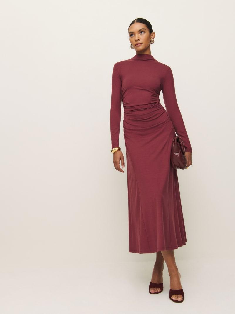 Get some compliments. Shop the Nemy Knit Dress from Reformation, a long sleeve maxi dress with a mock neckline and ruching through the bodice.