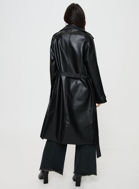 Black Faux Leather Contrast Stitch Split Hem Trench Coat
