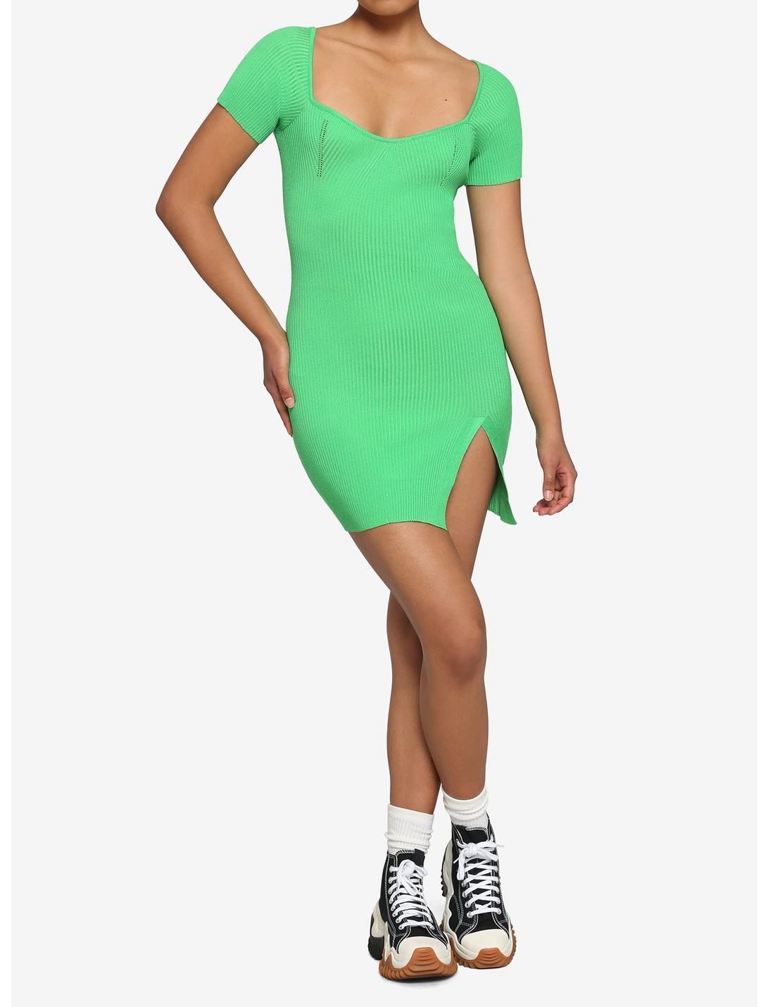 Stay cool and fashionable this summer in a new dress! This neon green one has ribbed detailing and a bodycon silhouette. There's even a flirty sweetheart neckline and slit on the front. Perfect for a night out with friends!78% rayon; 22% polyesterWash cold; dry lowStretchy materialLength: 33''ImportedListed in junior sizes
