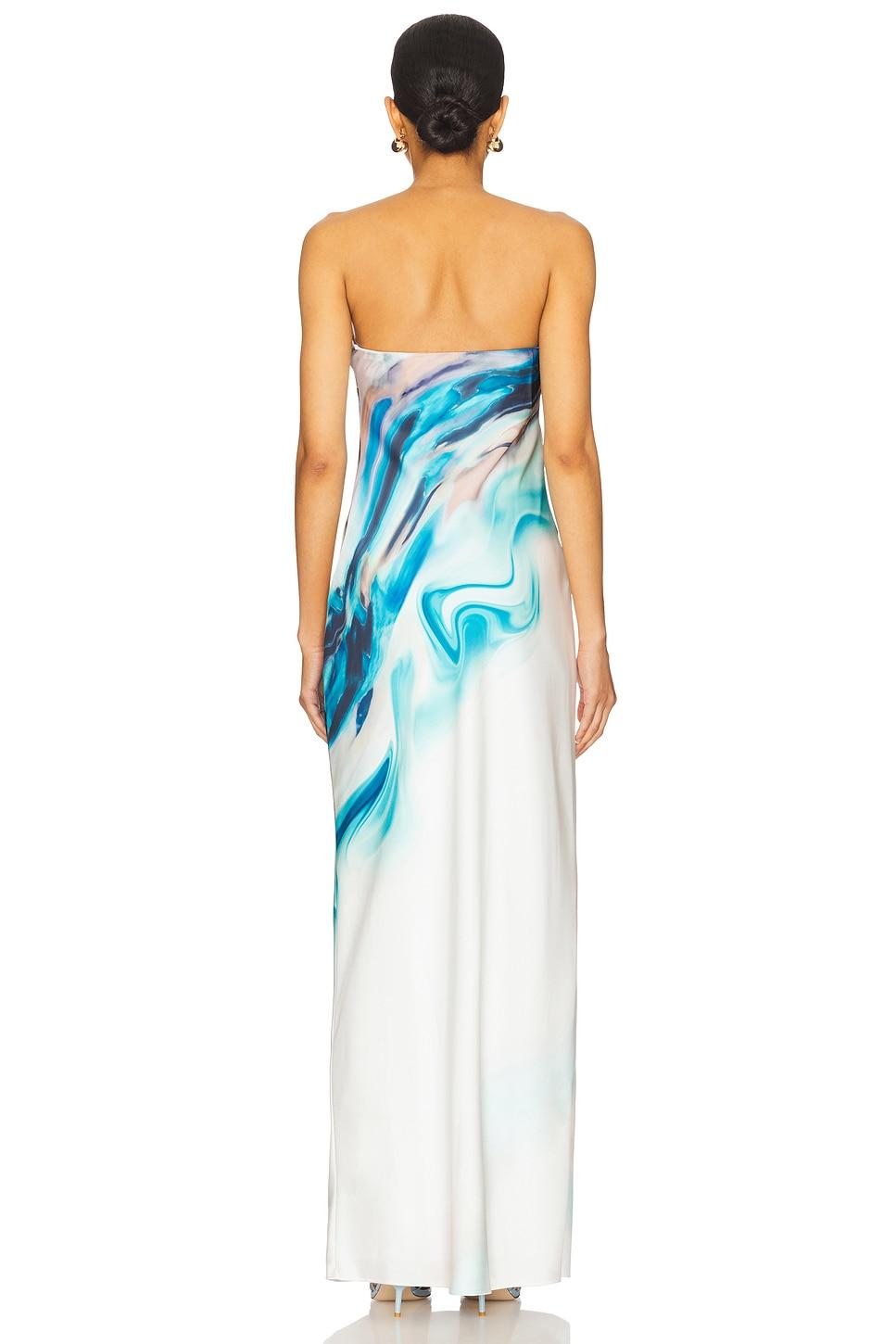 Self: 100% polyesterContrast Fabric: 93% nylon, 7% spandex. Dry clean only. Fully lined. Hidden side zipper closure. Boned bodice. Midweight satin fabric. Neckline to hem measures approx 52" in length. Made in China. Revolve Style No. ETOR-WD21. Manufacturer Style No. 70113952.