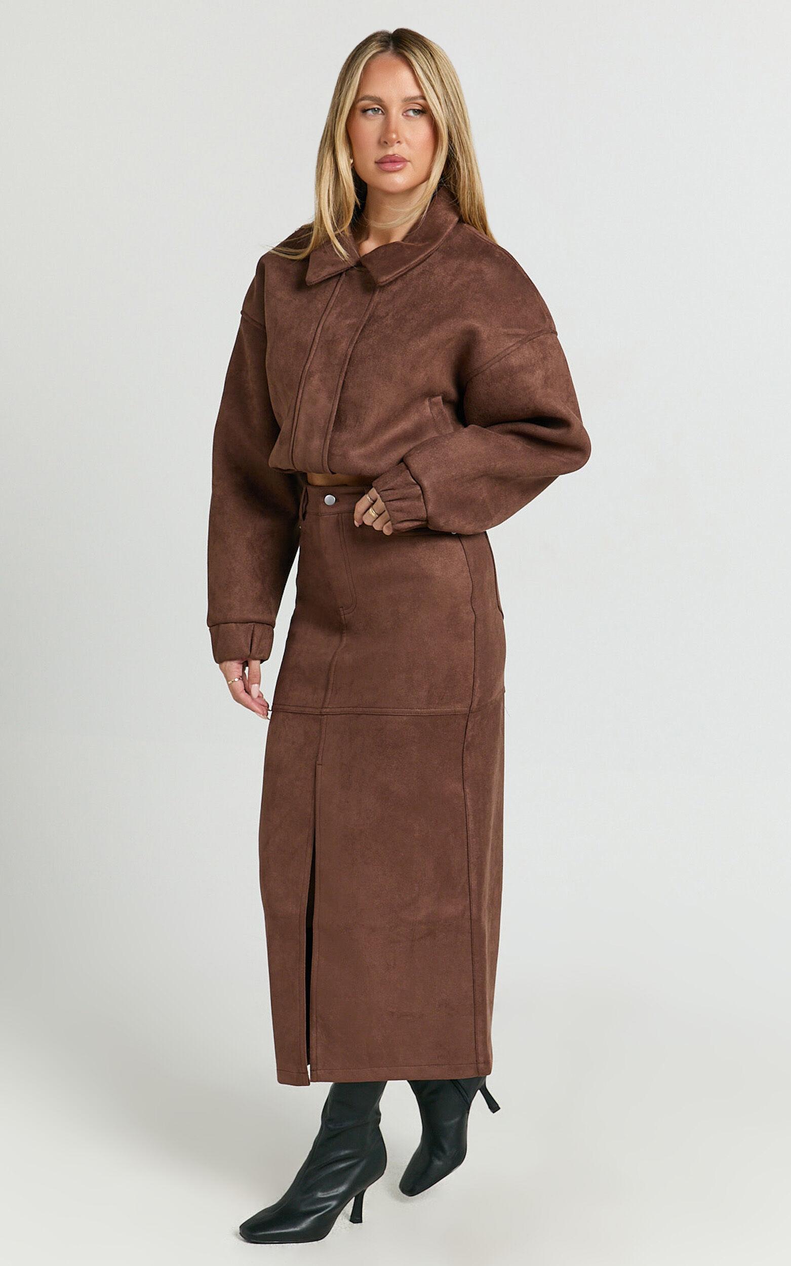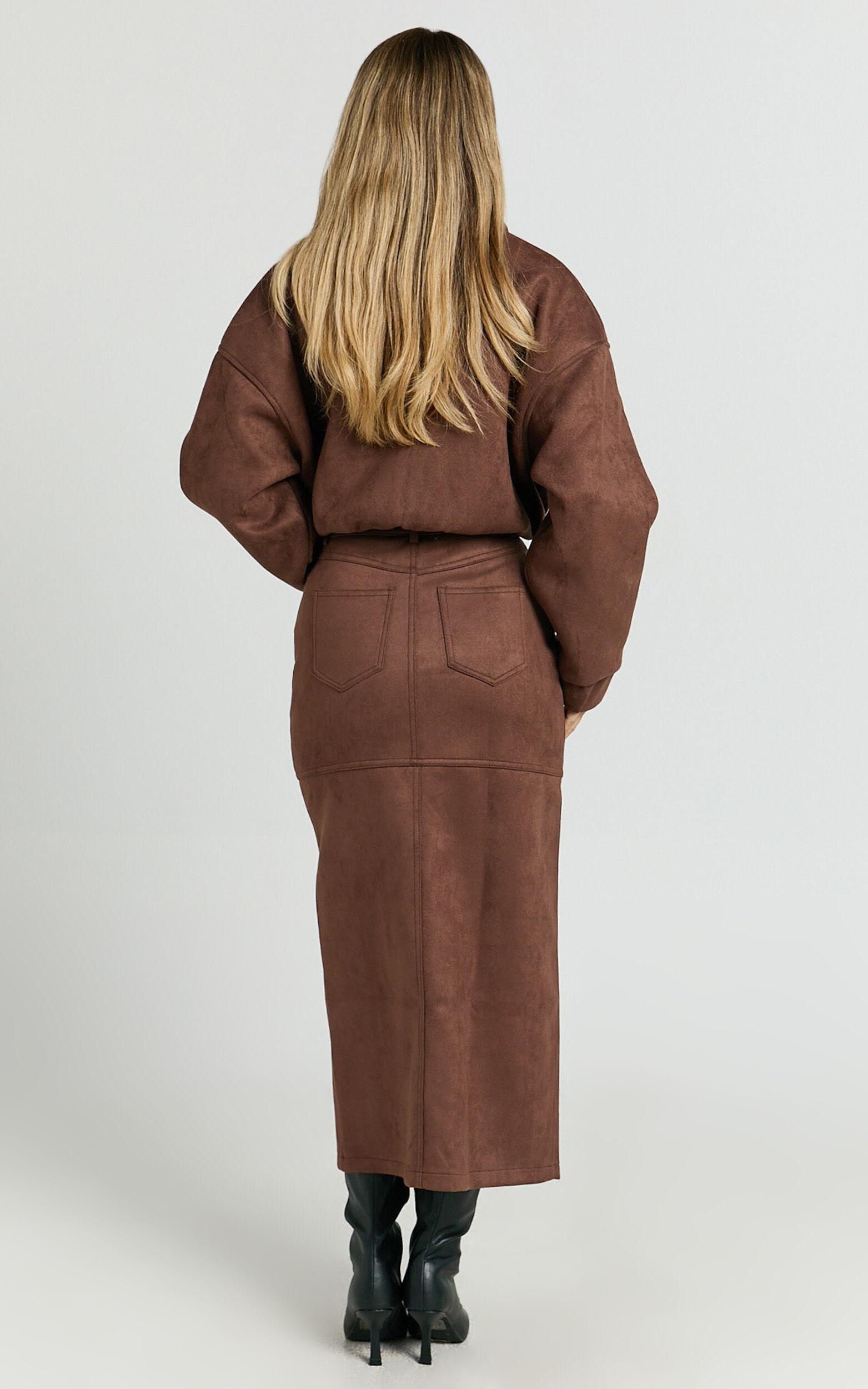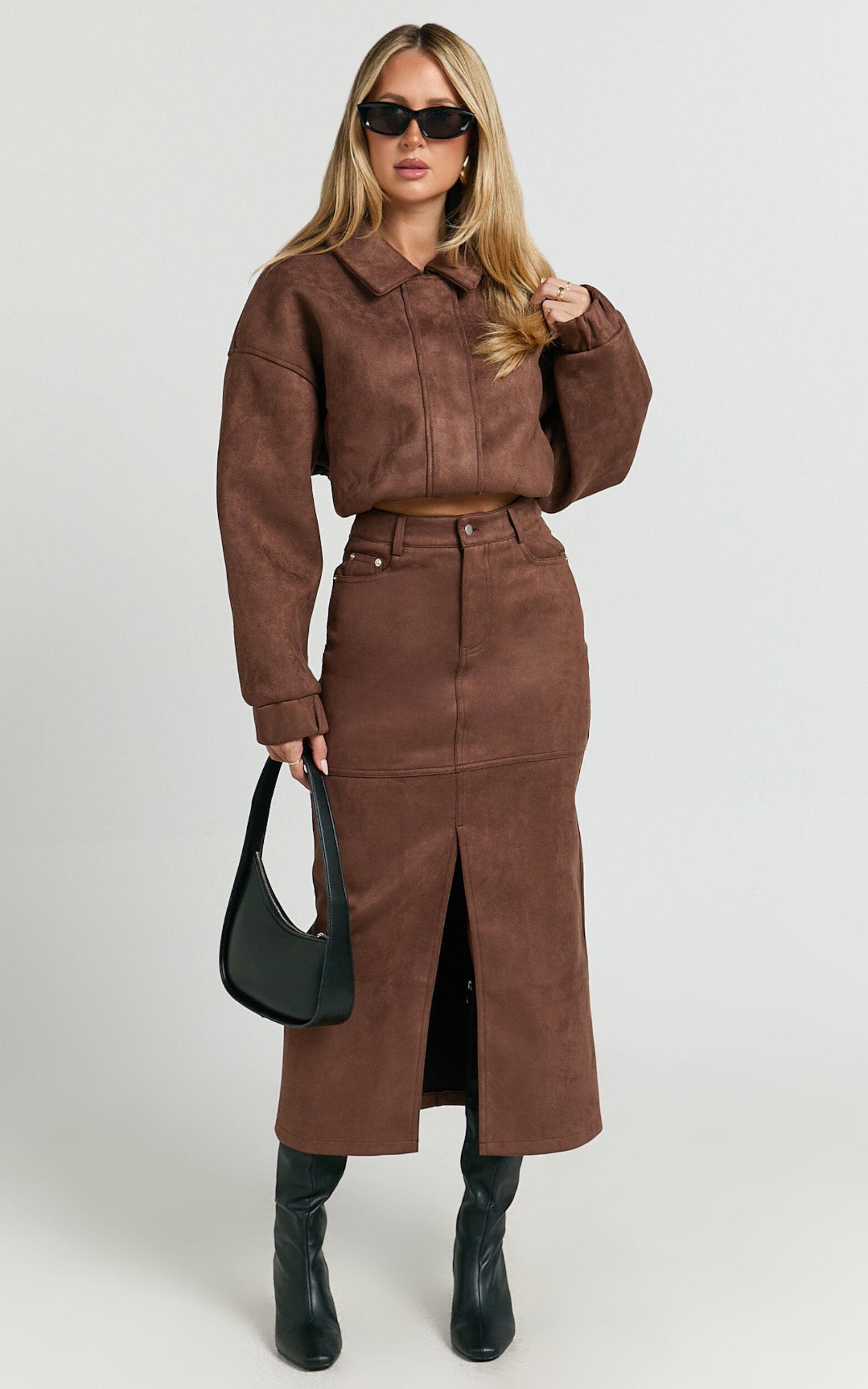 Make a statement in the Nessa Midi Skirt – your new go-to for seriously chic vibes! This high waisted, fitted pencil skirt hugs you in all the right places, serving major style in a luxe dark chestnut suede. The ultra-soft polyester fabric is made for comfort, so you can slay all day (and night!).Product Details:High waist fitMidi pencil silhouetteSuede polyester fabricZips and buttonsSize and FitSize S / 8 length: 93cm / 36.61inMaterial and CareMain Fabric: 92% Polyester, 8% Spandex Lining: 100% PolyesterNo Stretch
