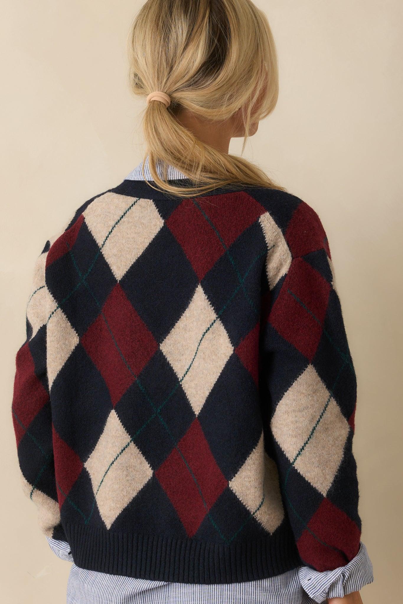 The Never Beyond Reach Navy Argyle Button Up Cardigan has a polished, preppy spirit, giving you that dependable layer that always adds the right touch of charm and sophistication to your look. This navy cardigan features a burgundy and ivory argyle pattern, a deep v-neckline, functional button front, long sleeves, ribbed hems, and a relaxed fit. 62% Polyester, 15% Acrylic, 15% Nylon, 5% Wool, & 3% Spandex Unlined Hand Wash Cold Manufactured in China Designed in The USA Model is 5'6" and is Wearing a Size Small