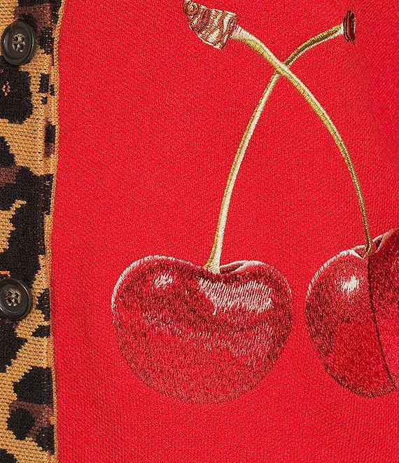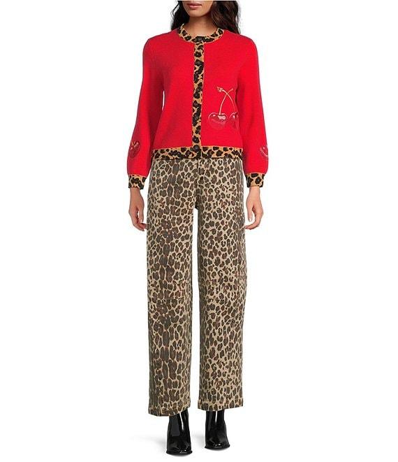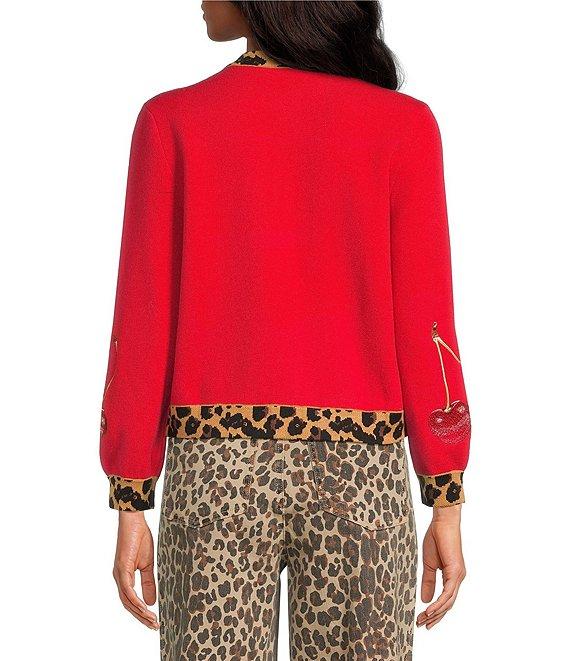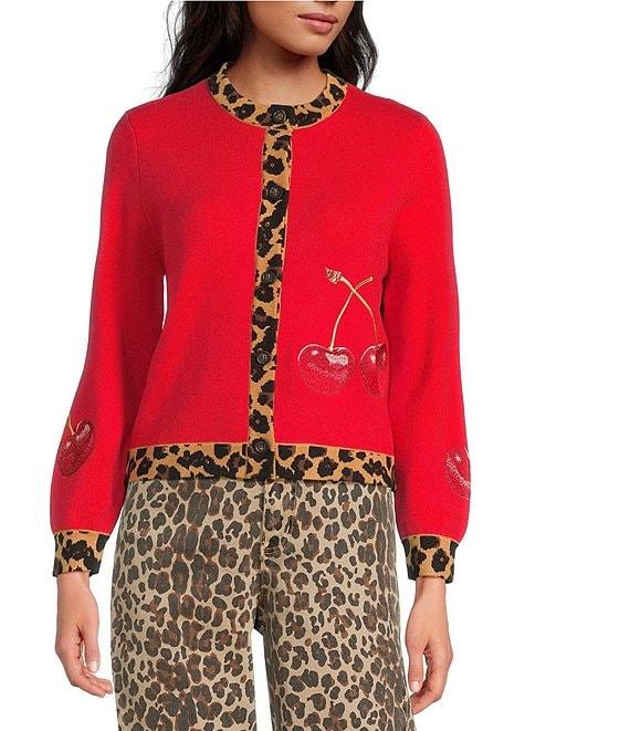From Never Fully Dressed, this cardigan features: Sweater knit fabrication Embroidered cherry motif Leopard print trim detailing Crew neckline Long sleeves Button front closure Approx. 20.86" length Viscose/polyester/polyamide Hand wash Imported.