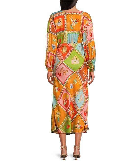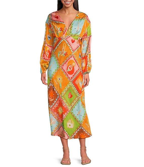From Never Fully Dressed, this dress features: Multicolored pattern V-neckline Long sleeve Pullover construction Elasticated waist seam detail Elasticated sleeves detail Zip fastening closure detail Approx. 49" length Polyester/elastane Machine wash/dry flat Imported.