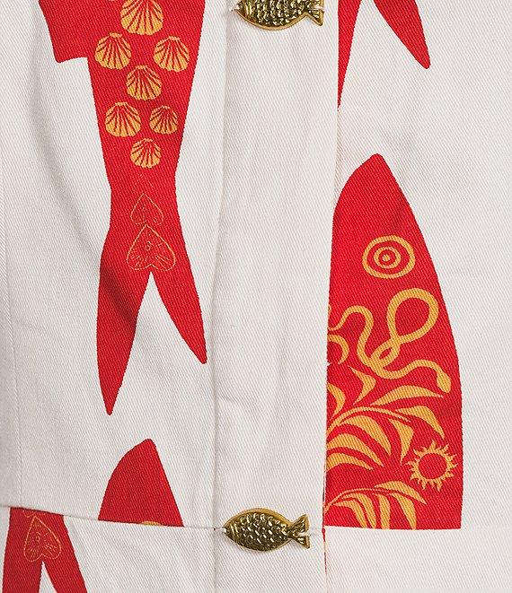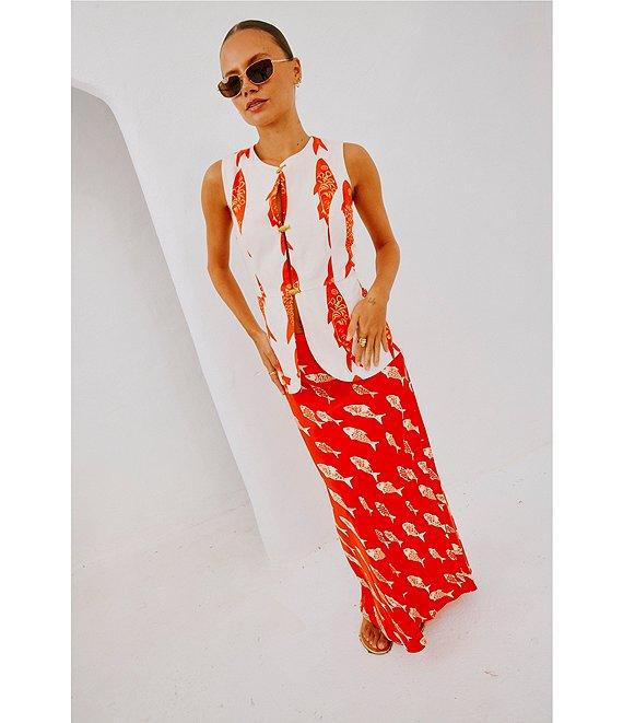 From Never Fully Dressed, this top features:Lightweight cotton fabricationWaistcoat silhouetteFish print Crew neckline SleevelessButton front closureGold fish button detailHidden popper fasteningApprox. 25" lengthCottonMachine washImported.