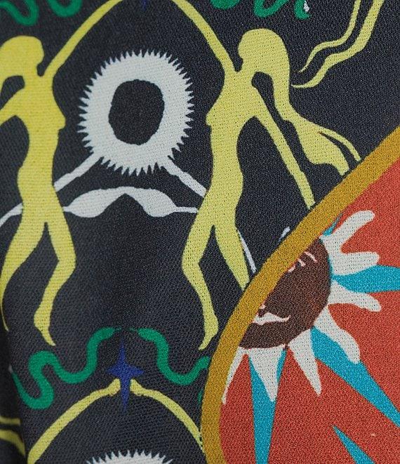From Never Fully Dressed, this dress features: Multi print motif Round neckline Cap sleeves Ruffle detail at sleeves and neckline Partial button closure Approx. 49" length Polyester Machine wash/dry flat Imported.
