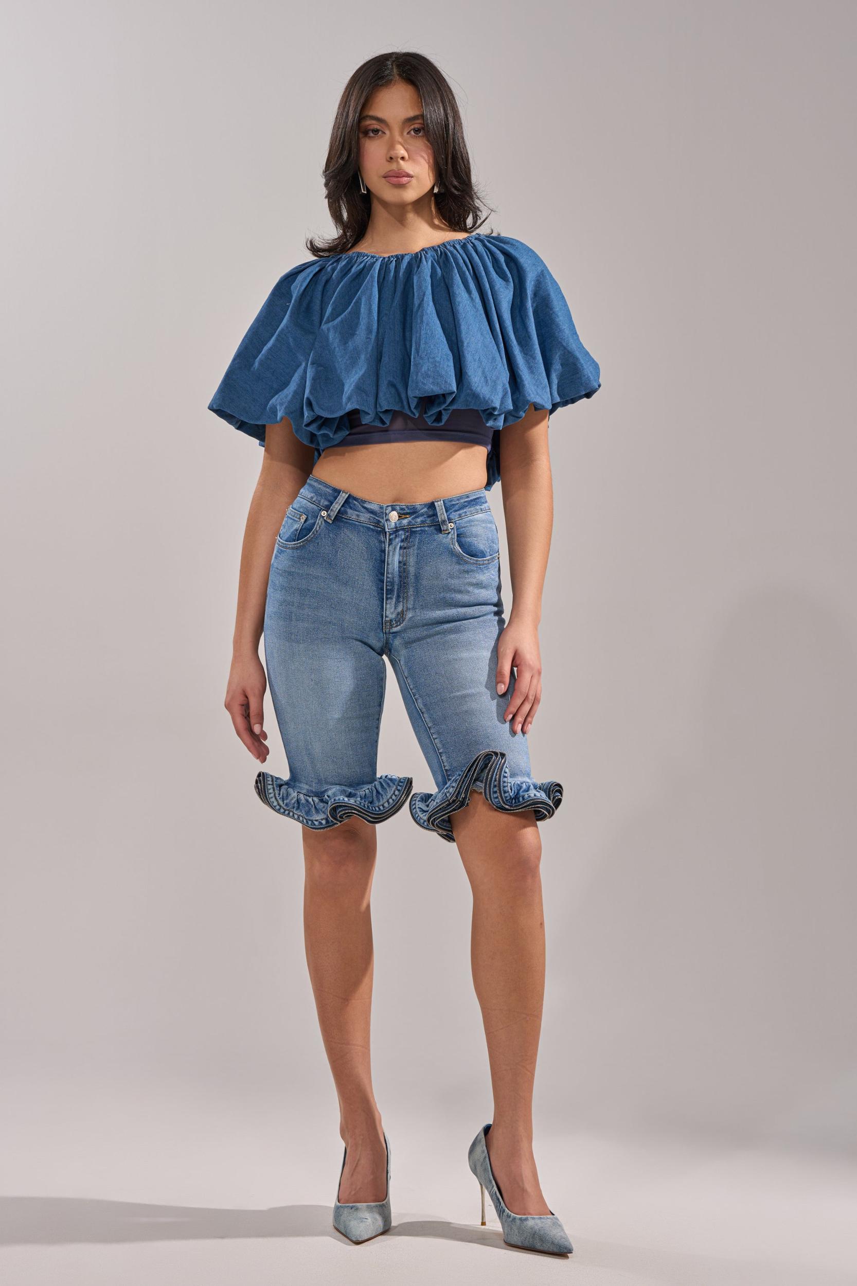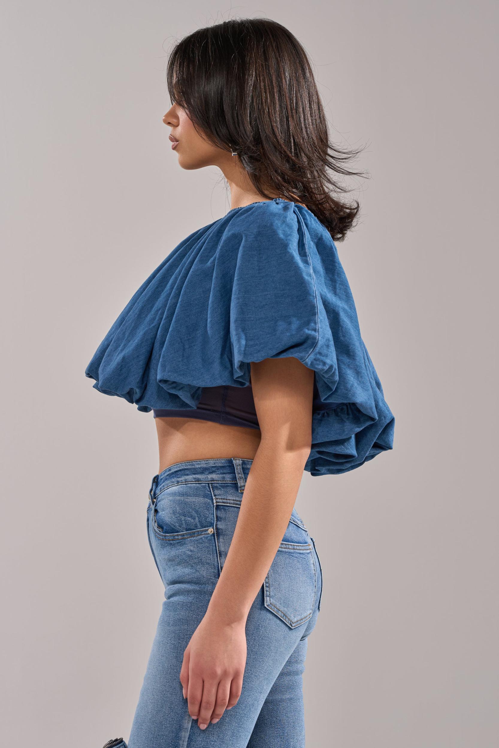 No one can rain on your parade when you’re wearing The AKIRA Label Never Going To Stop Blouse In Medium Blue Denim. Crafted from a lightweight chambray denim fabric, this top features an elasticized neckline and hem, a voluminous, gathered body that drapes effortlessly over the shoulders and bust, and a stretchy mesh inner tank. Complete with a cropped, pull-on fit. Its airy, oversized silhouette is ideal for transitional weather and statement layering. - Main: 90% Cotton 10% Polyester, Lining: 95% Nylon 5% Spandex- Little Stretch- Imported (all measurements approximate from size S/M)- 14” Shoulder to Hem- 16” Shoulder to ShoulderProduct ID: 1069413