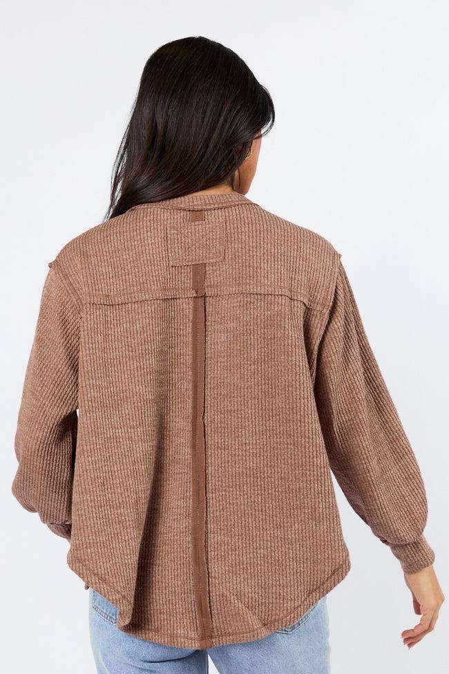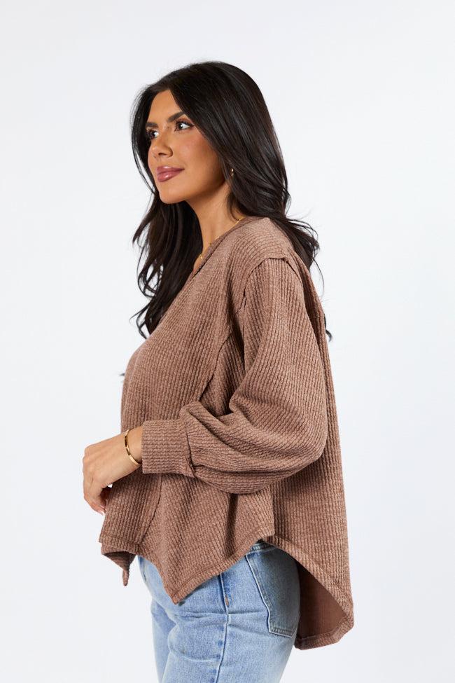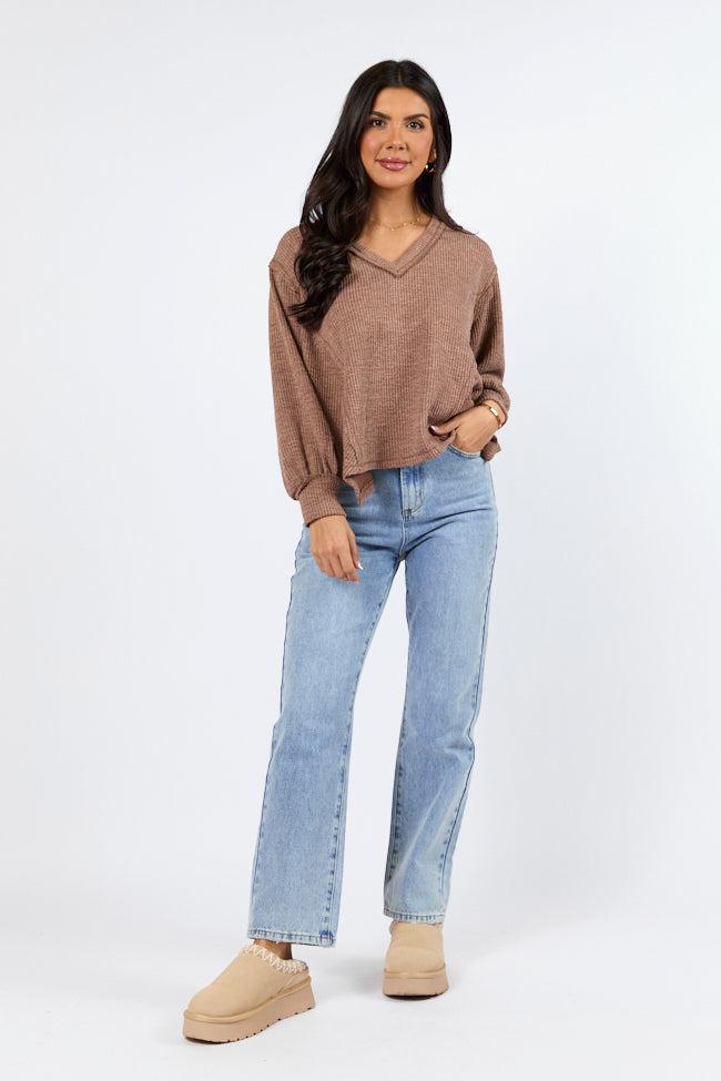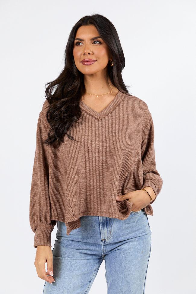 Details Brown Ribbed Knit V-Neck Long Sleeve Top Fabric has stretch V-neckline, long sleeves, exposed hem Unlined Size small from shoulder to hem: 21" Material and Care 97% polyester 3% spandex Hand wash cold, no drum drying Patterns may vary Materials may have natural variations Colors may vary from different viewing devices.