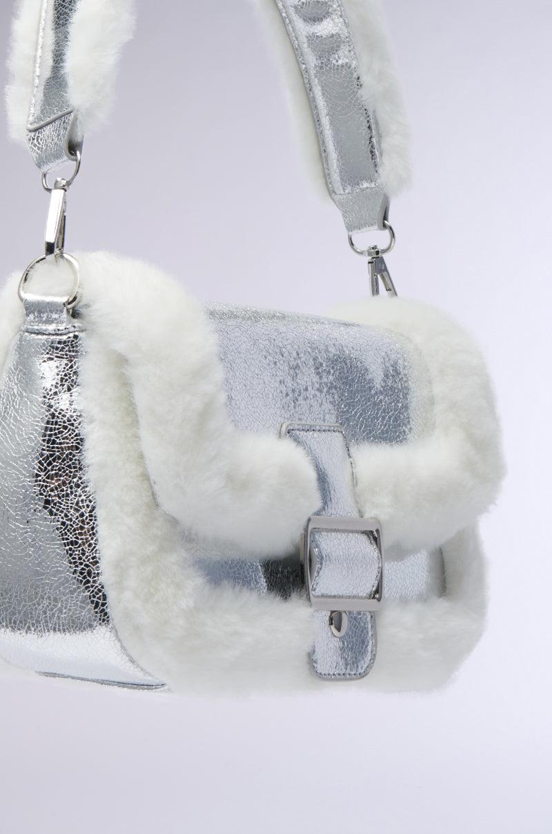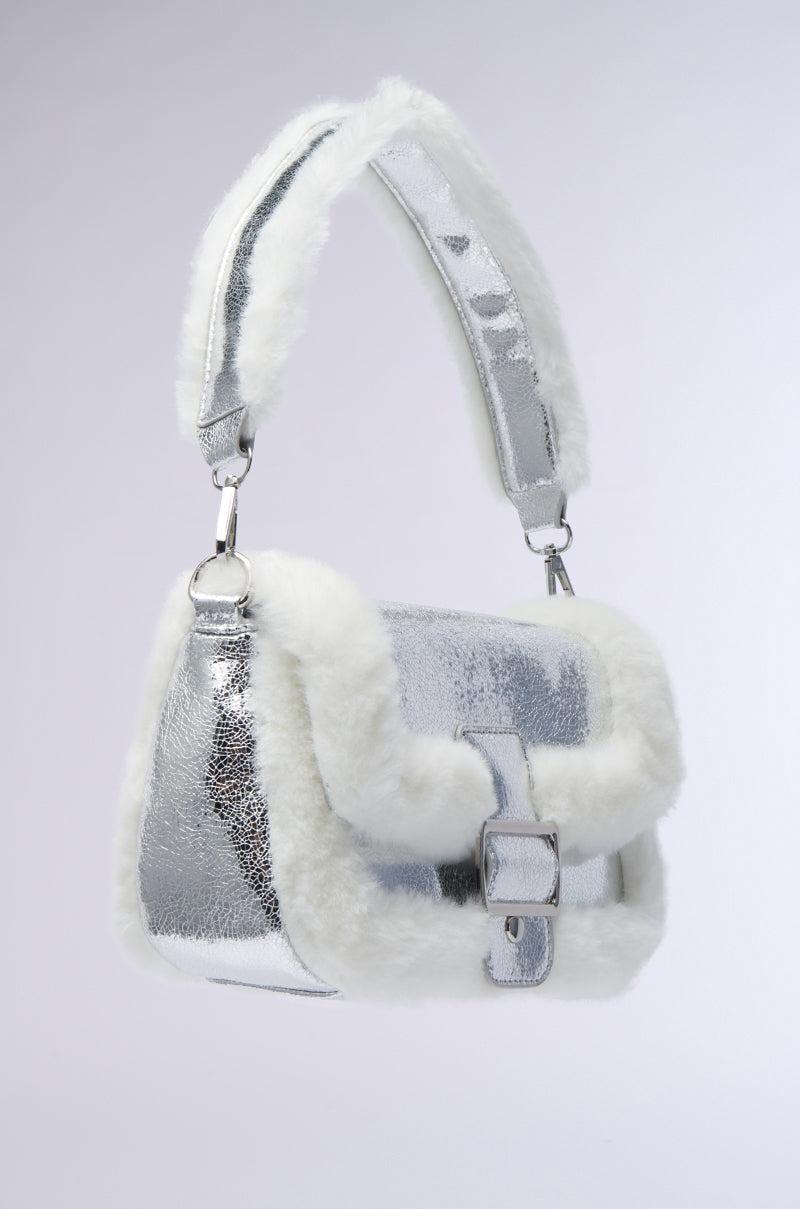 You got something different goin’ on when you carry The AKIRA Label Never The Pick Me Fur Trim Purse with you. This winter chic accessory is crafted from a textured metallic base and features a structured rectangular silhouette, an oversized metallic buckle detail with a magnetized button closure, luxe faux fur trim throughout, and a coordinating fur-trim wide top handle. Complete with a roomy lined interior with one slip pocket and one zippered pocket. Includes a coordinating, removable metallic strap for a crossbody fit. - 80% PU 20% Fur (all measurements approximate from size O/S)- 10” Bag Length x 2.75” Width x 6” Height- 20” Top Handle- Imported Product ID: 467867