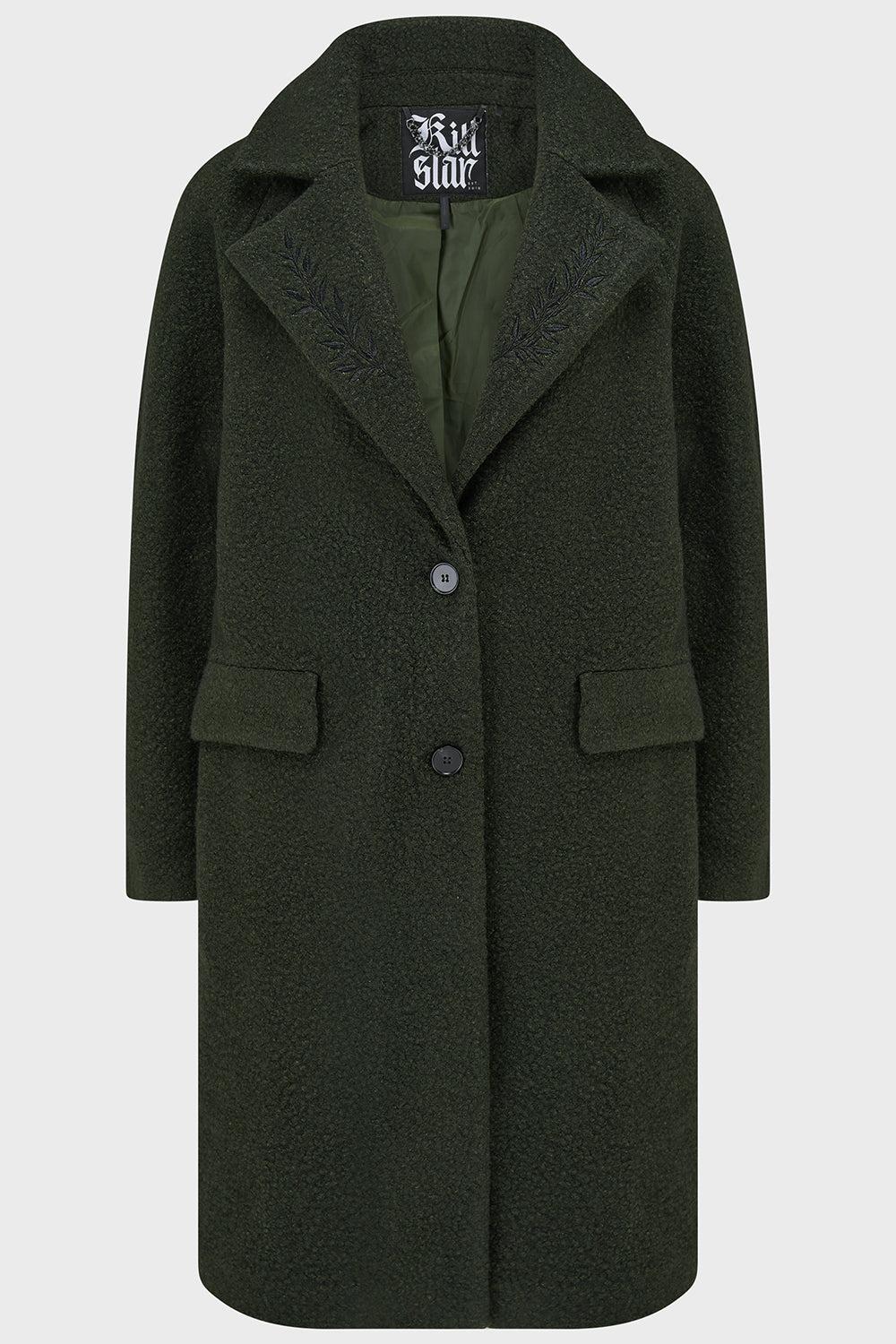 NEVERMORE- High quality textured boucle fabric.- Long relaxed sleeves.- Fitted for layering.- Embroidered laurel leaf detail in lapel.- Single breasted two button closure.- Functional pocket with flap.- Fully lined.- Designed in Brighton, England.Model is 5'7 and wears a XS.With KILLSTAR branding, Fabric : 100% Polyester Lining : 100% Polyester.Machine wash cold (30°c) / Do not bleach / Do not tumble dry / Iron at low temperature / Do not dry clean. Imported.