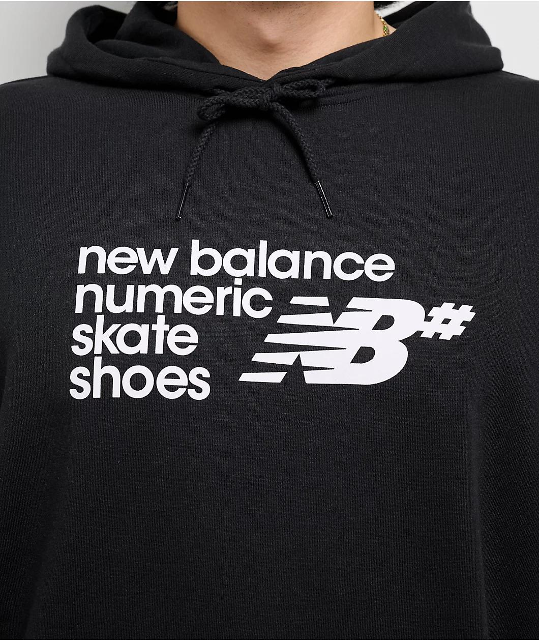 Represent New Balance Numeric with the Logo hoodie, arriving in black. The pullover features white branding on the chest for the company's skate shoes, with a smaller number icon on the left sleeve adding a modern twist. A kangaroo pouch pocket is th