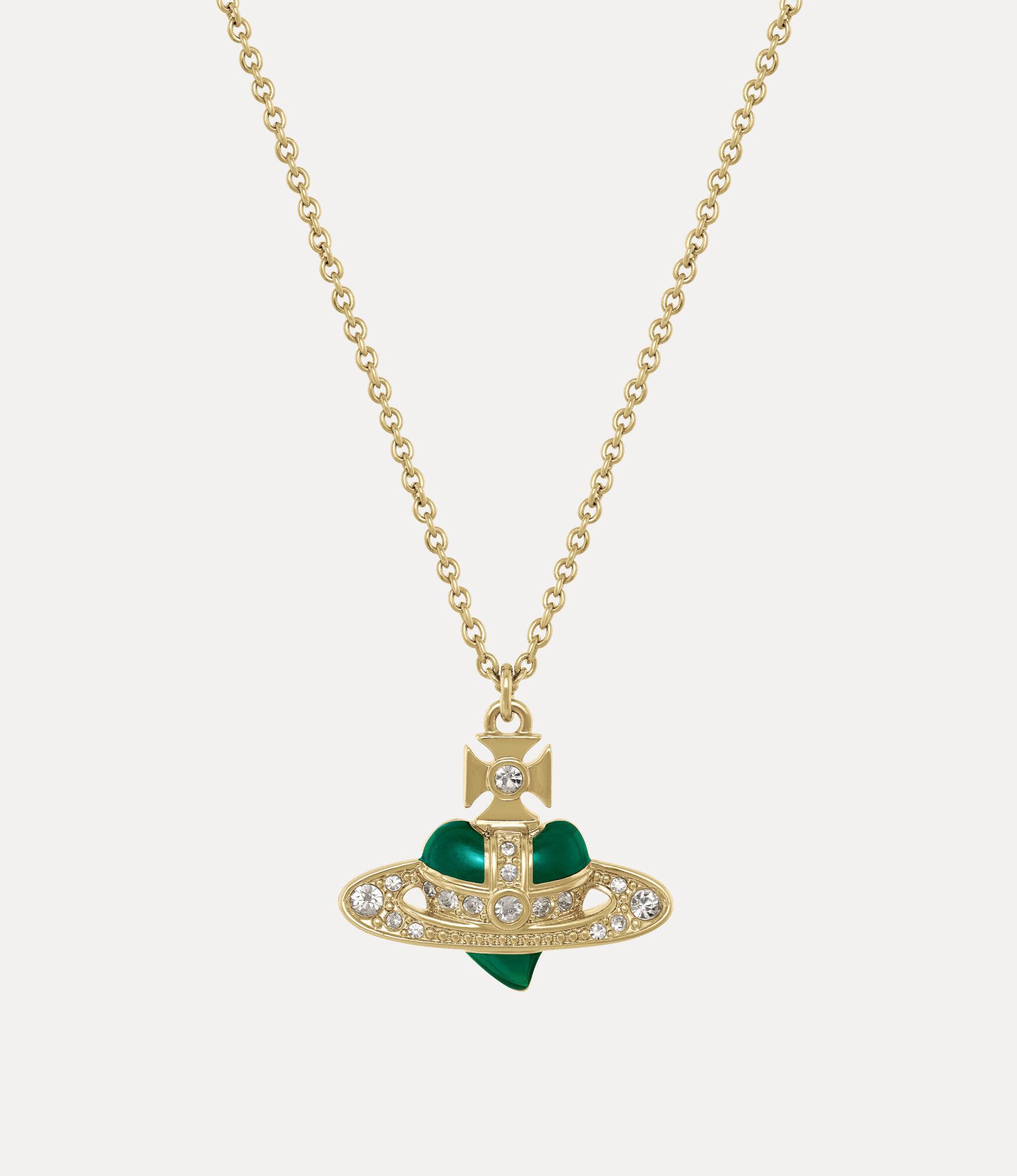 The heart shape has become a signature style of the house, synonymous with Vivienne's affection for both humanity and the planet. Our New Diamante Heart Pendant necklace revives our iconic asymmetric heart silhouette, outlined with gold-coloured crystals and finished with hand-painted translucent enamel in the centre of the design.
