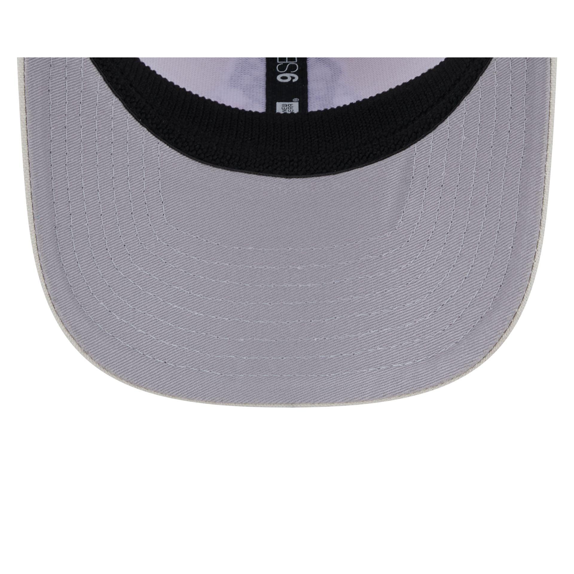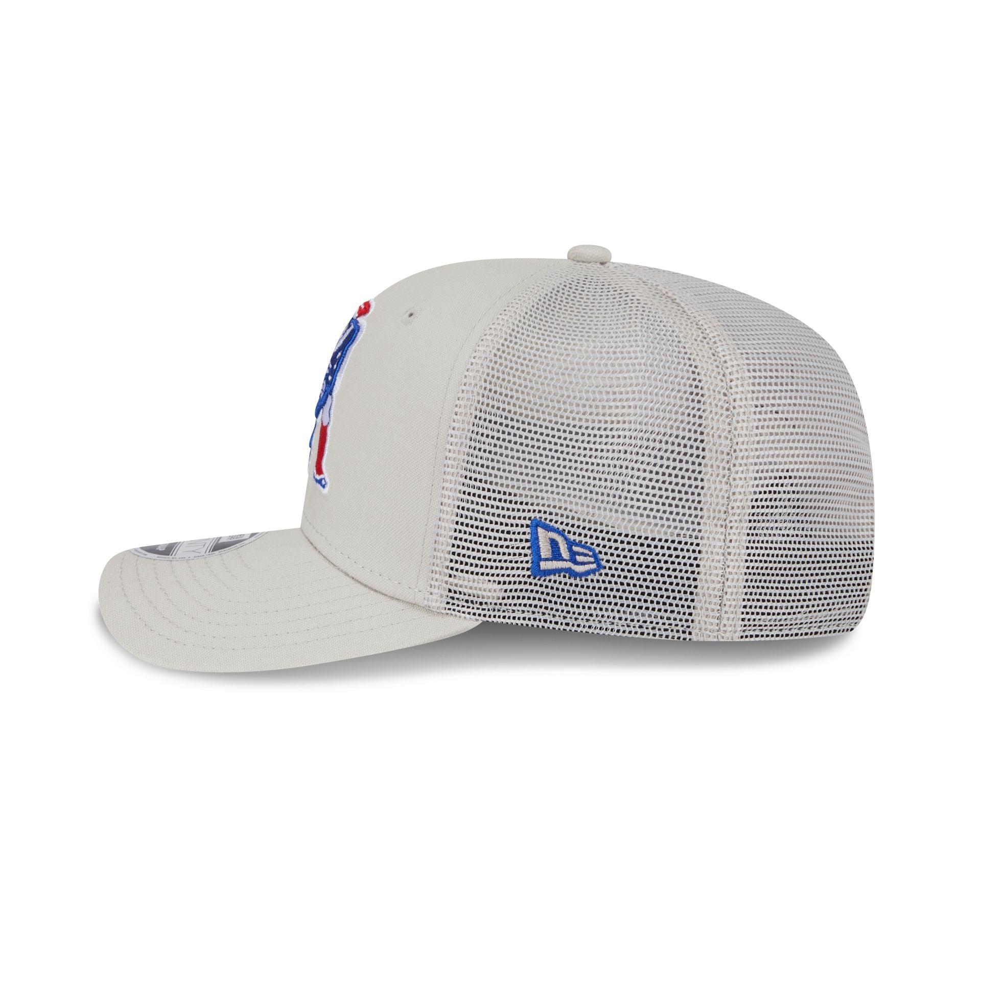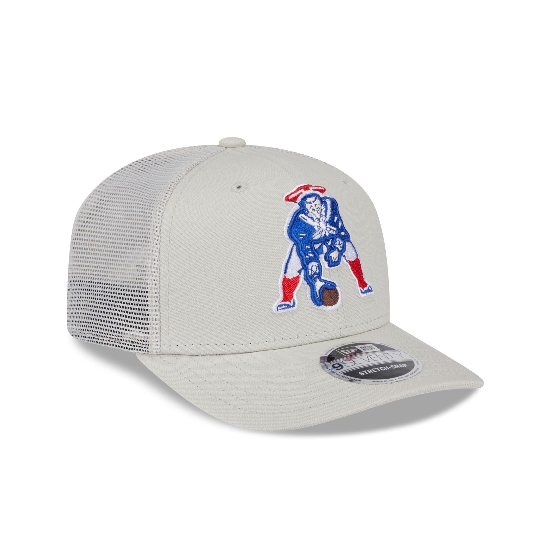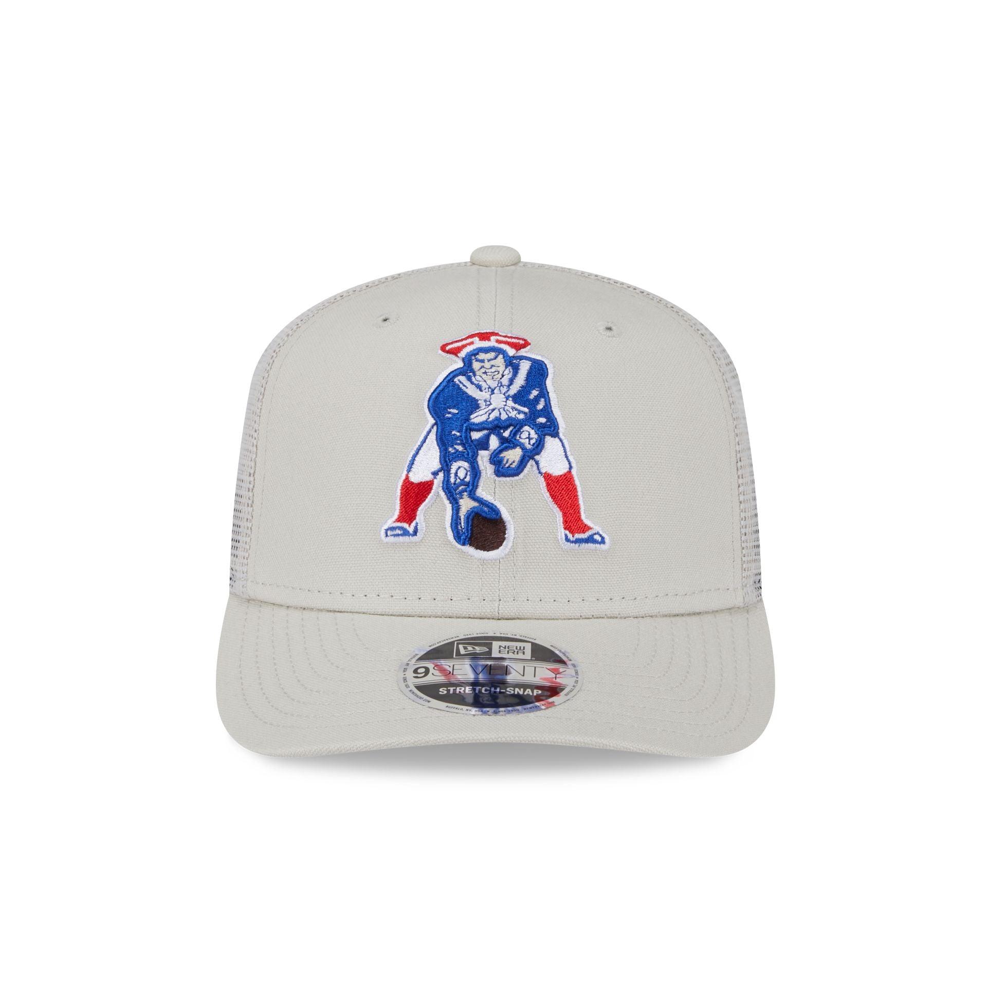 The New England Patriots Canvas 9SEVENTY Trucker features an embroidered Patriots Historic logo at the front panels with a matching New Era Flag at the left-wear side. Additional details include a gray undervisor and a snapback closure a the rear.