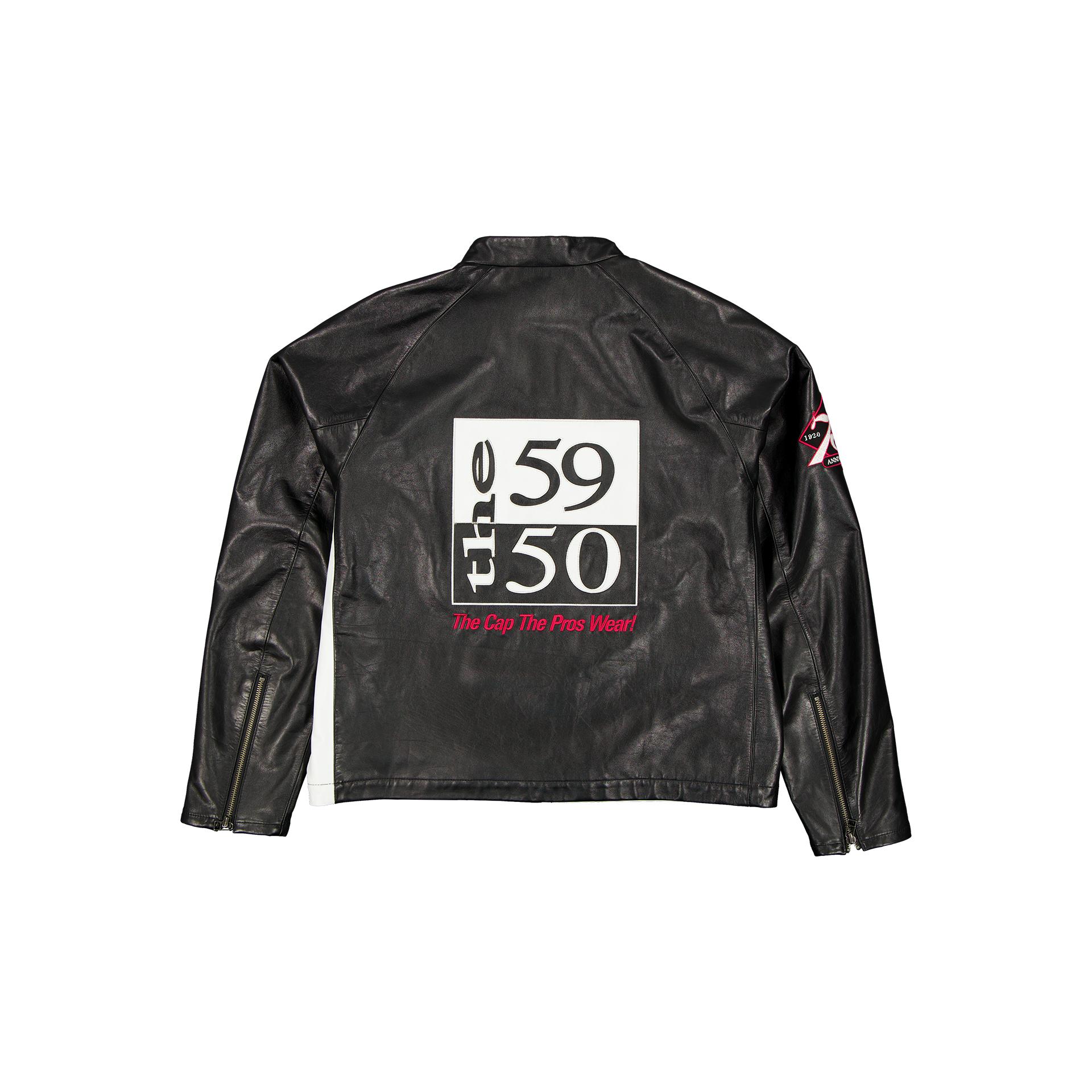 The New Era Branded 59FIFTY 2&2 Moto Jacket features: Embroidered New Era Cap logos at the left chest 75th Anniversary patch at the right sleeve Self-leather applique at the chest and rear 2-way zipper closure Fully lined Woven label at the interior left pocket Sleeve zippers Cropped, moto fit Color: Black & White Fabrication: 100% Leather