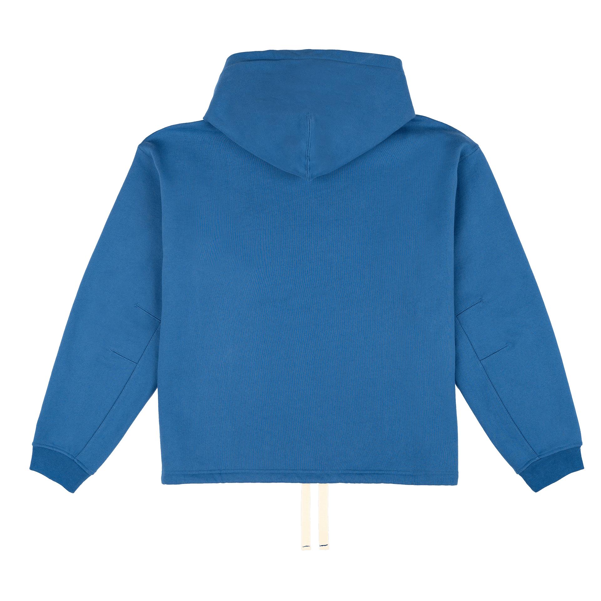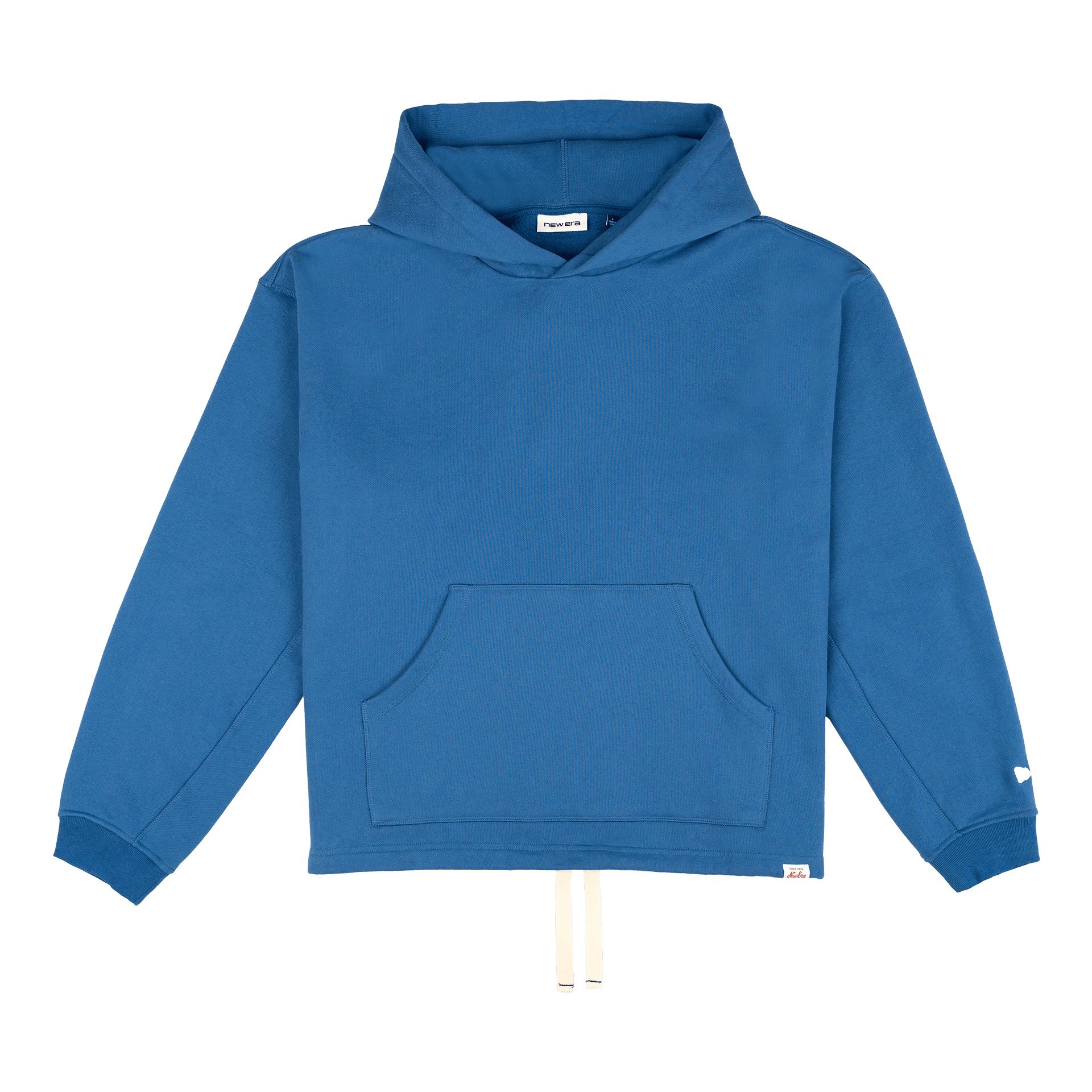 The New Era Branded Alden Indigo Hoodie features: New Era wrap-around label at hem New Era Flag logo patch at sleeve Ribbed sleeve cuffs Kangaroo pocket at the front Adjustable drawstring hem 500 GSM heavyweight Cotton fleece Coverlock stitching Relaxed fit Color: Indigo Fabrication: 50% Recycled Cotton, 50% Organic Cotton