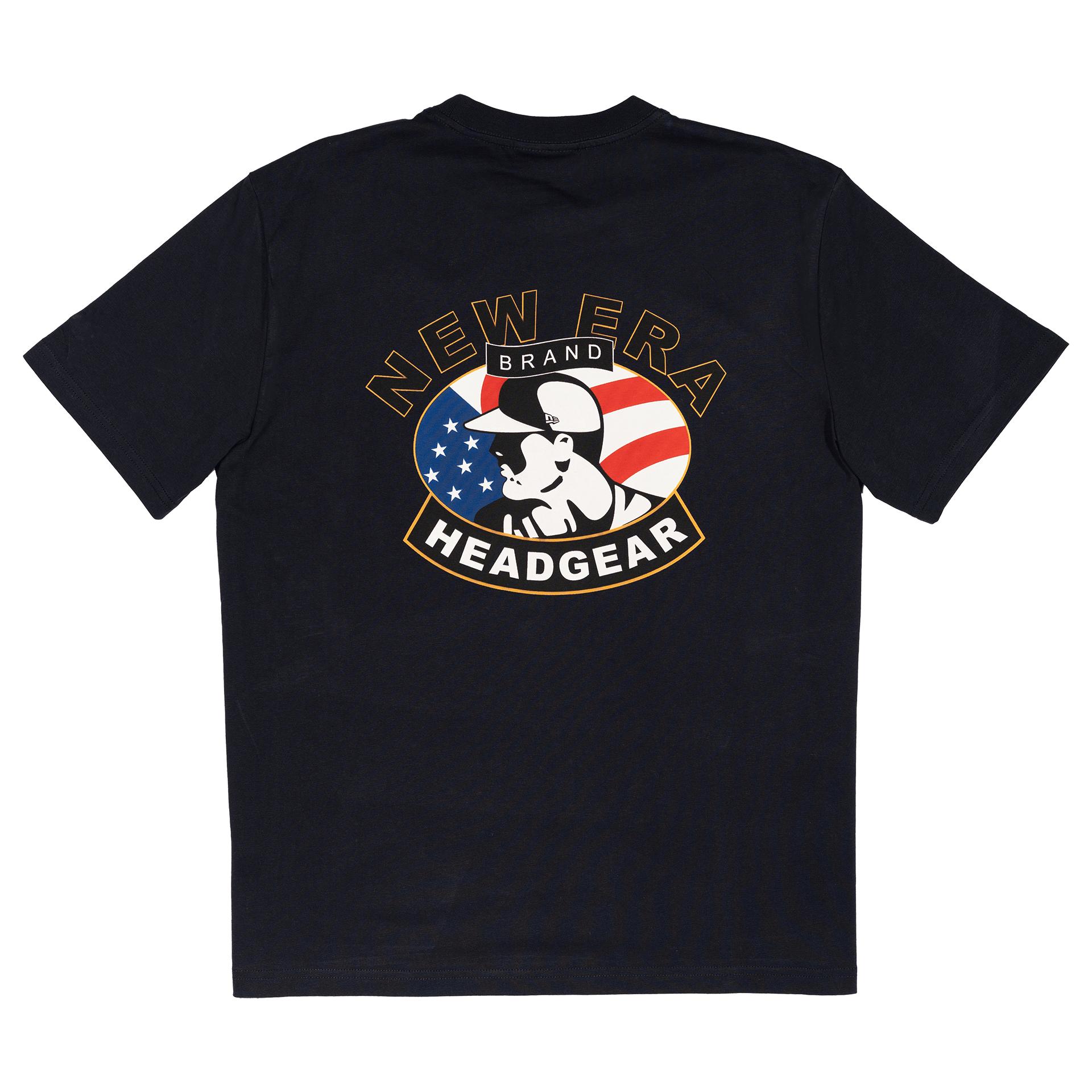 The New Era Branded American Headgear Navy T-Shirt features: Screen-printed New Era graphic at left chest Screen-printed graphic at the rear New Era Flag embroidered at left sleeve 220 GSM jersey Standard fit Color: Navy Fabrication: 100% Cotton