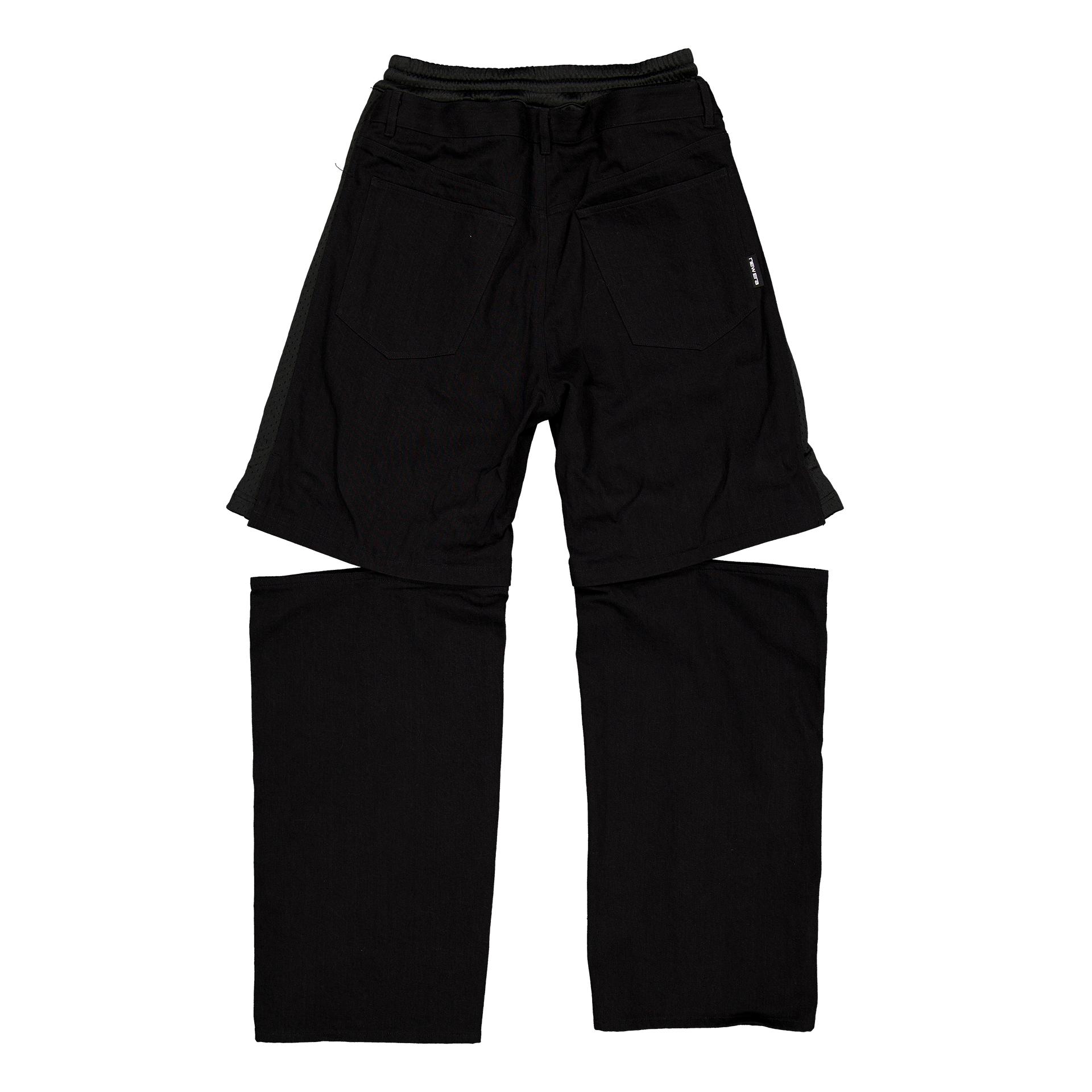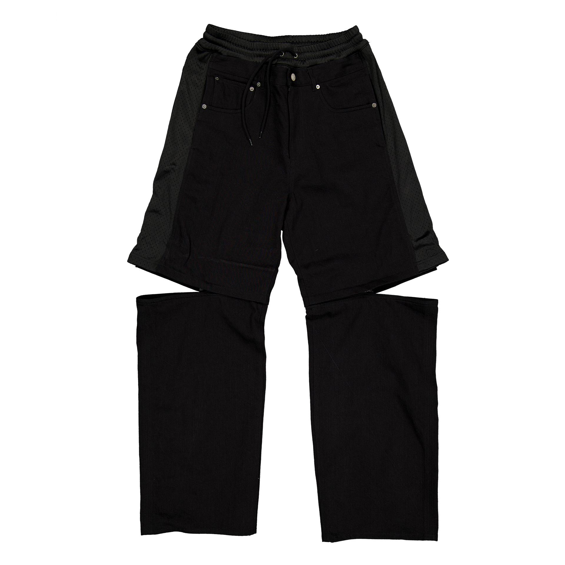 The New Era Branded Mutation Mesh Black Denim Jeans feature: Elasticated waistband with drawstrings Denim and mesh paneling Cold knee Detachable bottom leg Functional coin, side, and back pockets Relaxed Fit Color: Black Fabrication: 100% Cotton