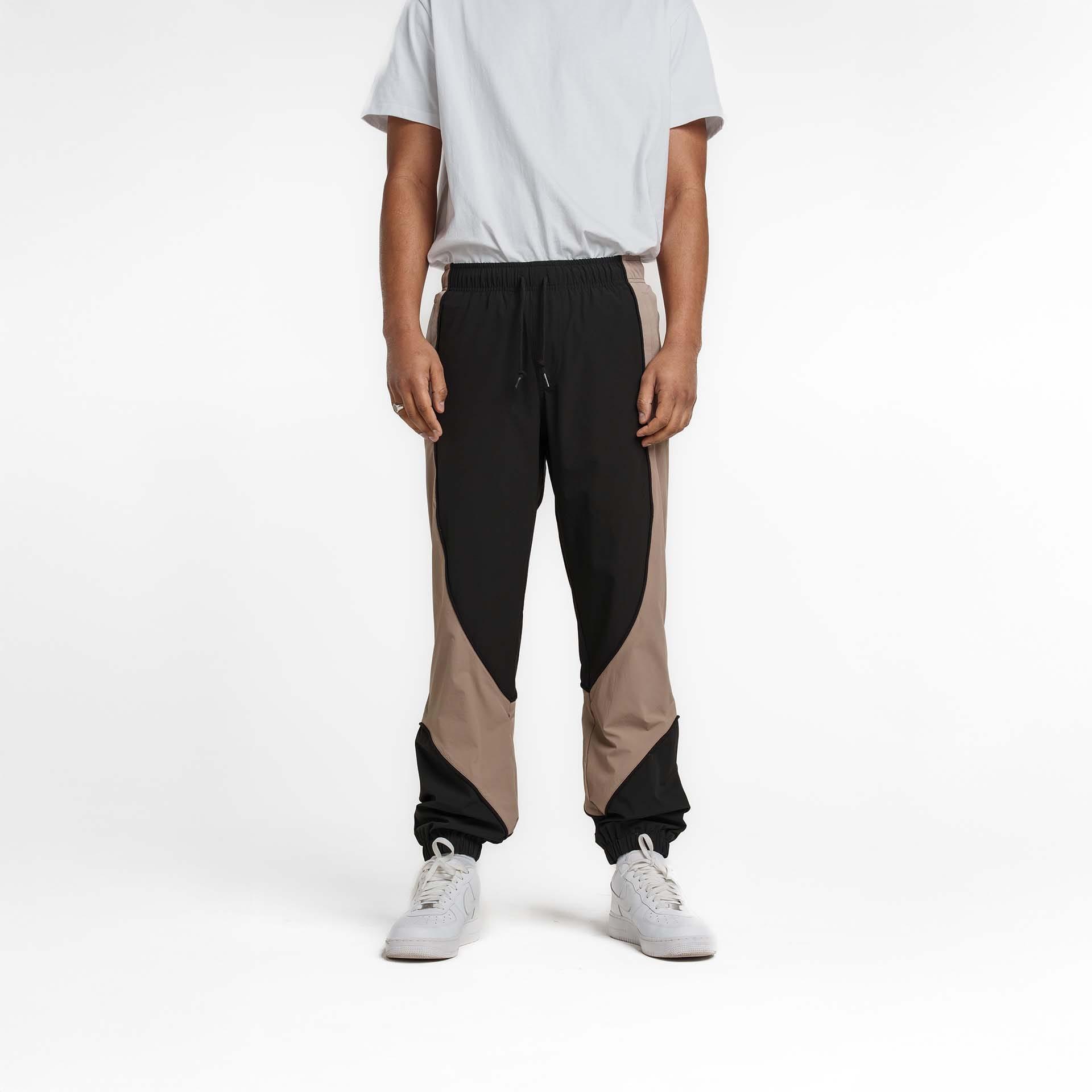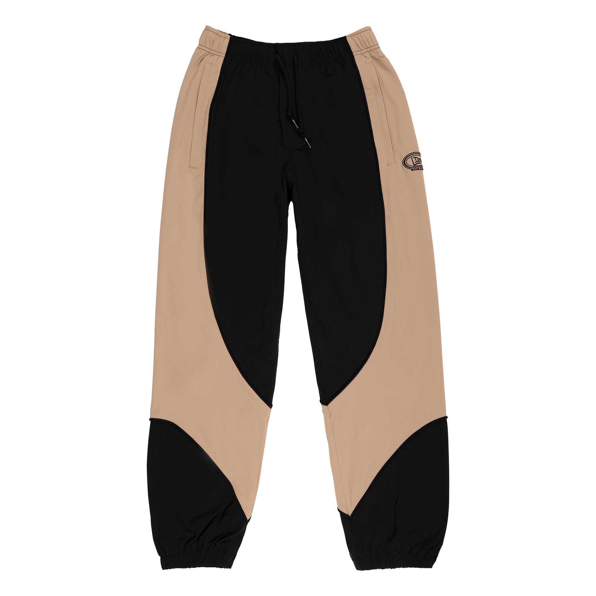 The New Era Branded Retro-Tech NE2K Black Track Pants features: Elasticated waistband with drawstring Elasticated cuffs Faux fly stitch detail New Era logo embroidered at the right leg Color-blocked paneling with piping on seams Welt pockets with concealed zipper closures Back welt zipper pocket at the rear Standard fit Color: Black Fabrication: Shell – 100% Nylon, Liner – 100% Polyester