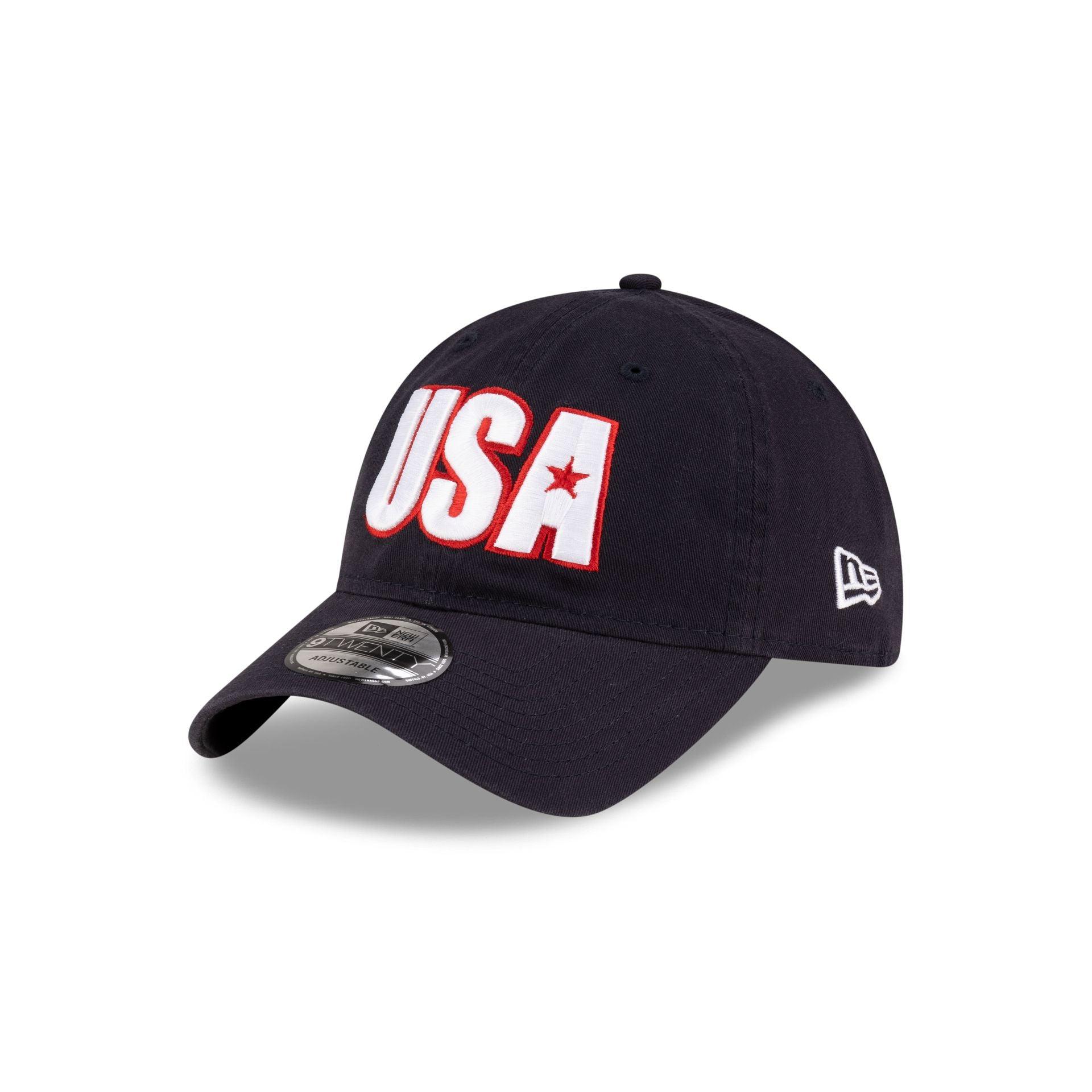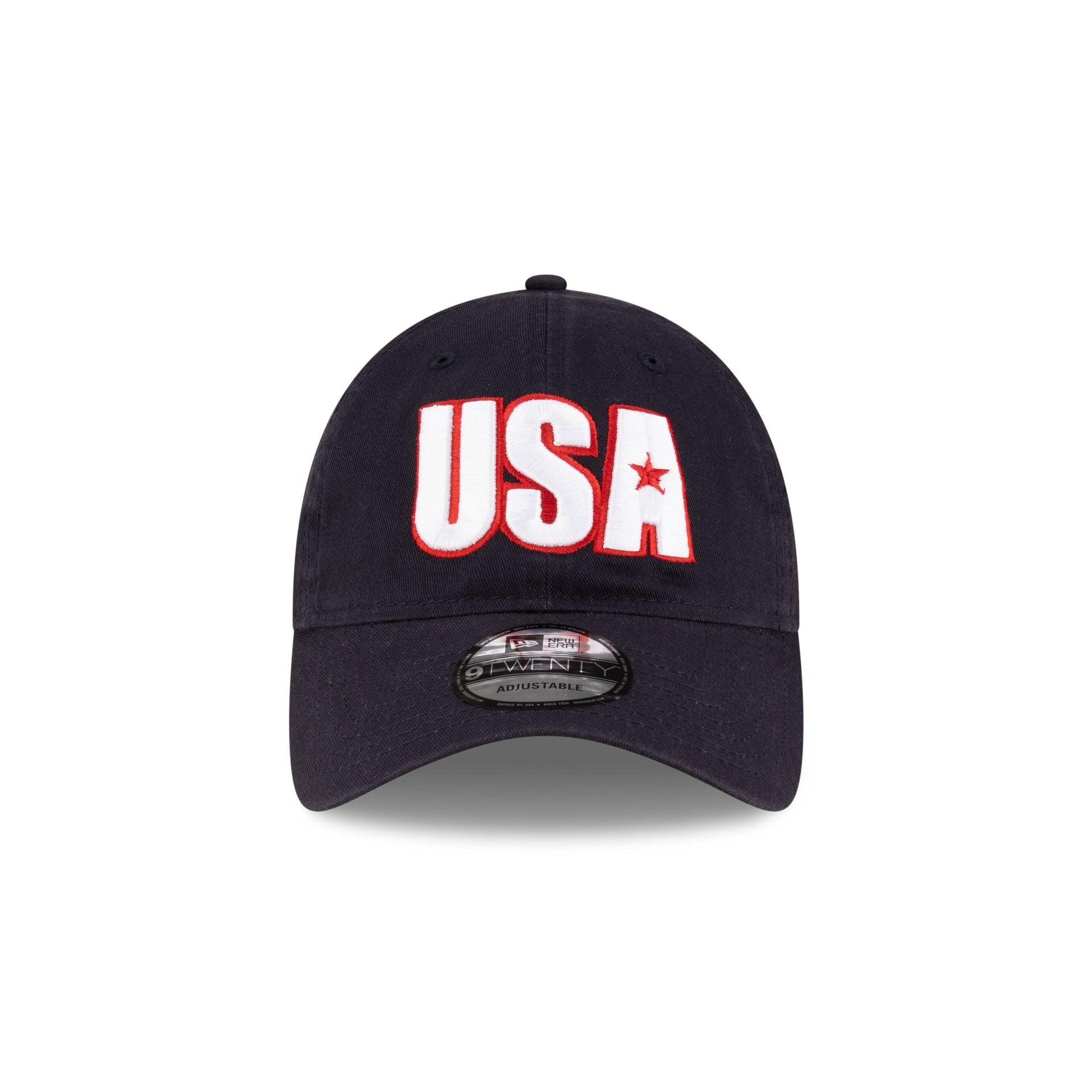 The New Era Cap USA Star Navy 9TWENTY Adjustable Cap features an embroidered USA wordmark at the front panels with an adjustable D-Ring closure at the rear.