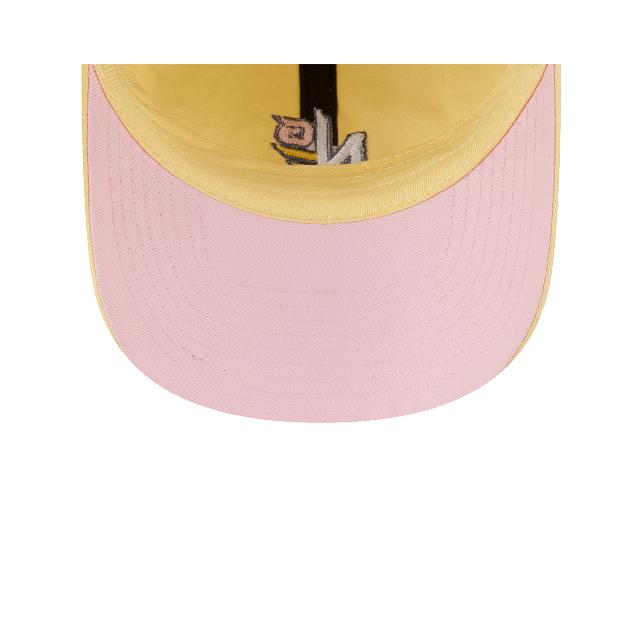 The New Era Golf Yellow Casual Classic Adjustable Cap features an embroidered New Era Golf logo at the front panels with a corresponding wordmark above an adjustable closure at the rear and a pink undervisor.