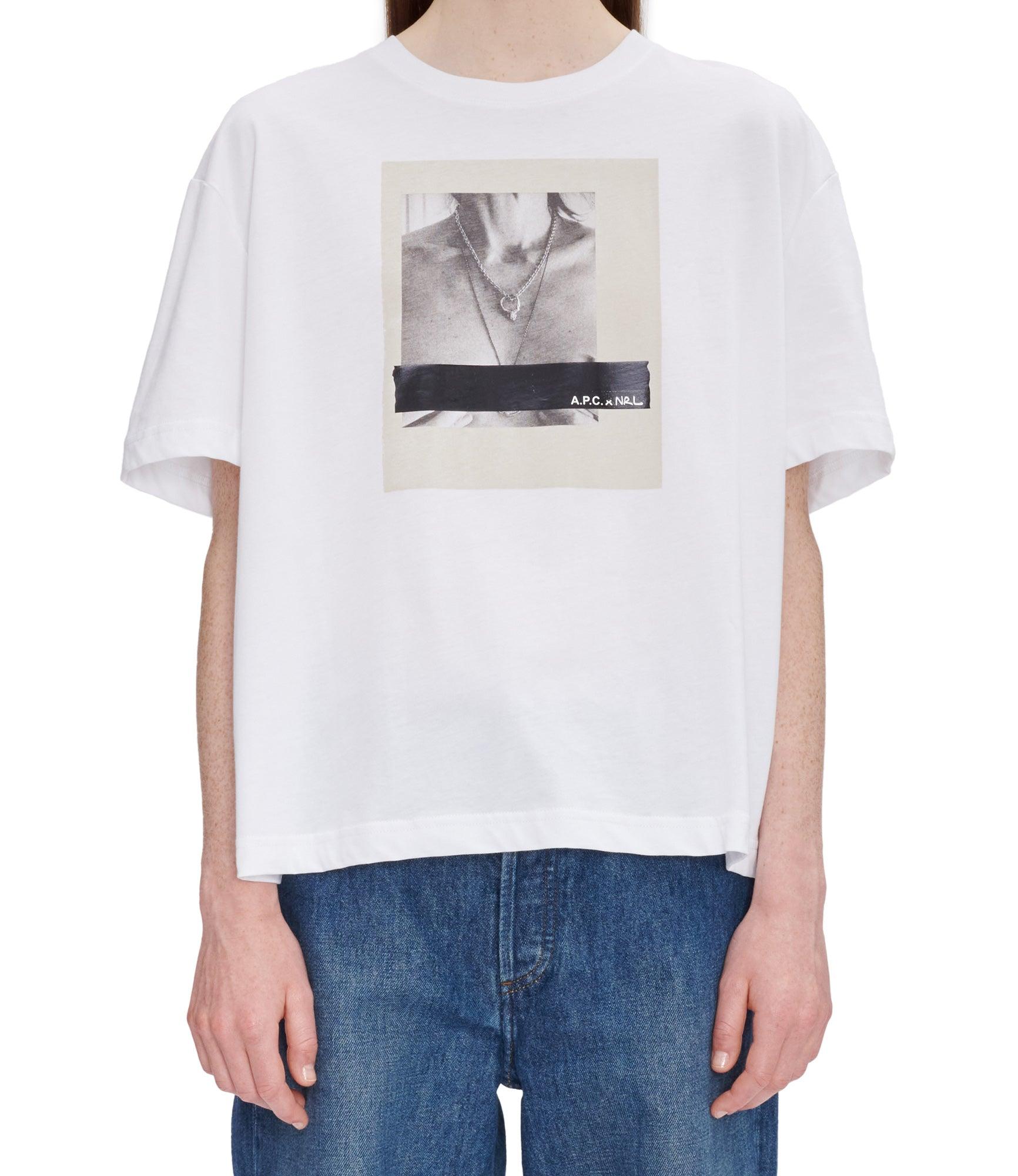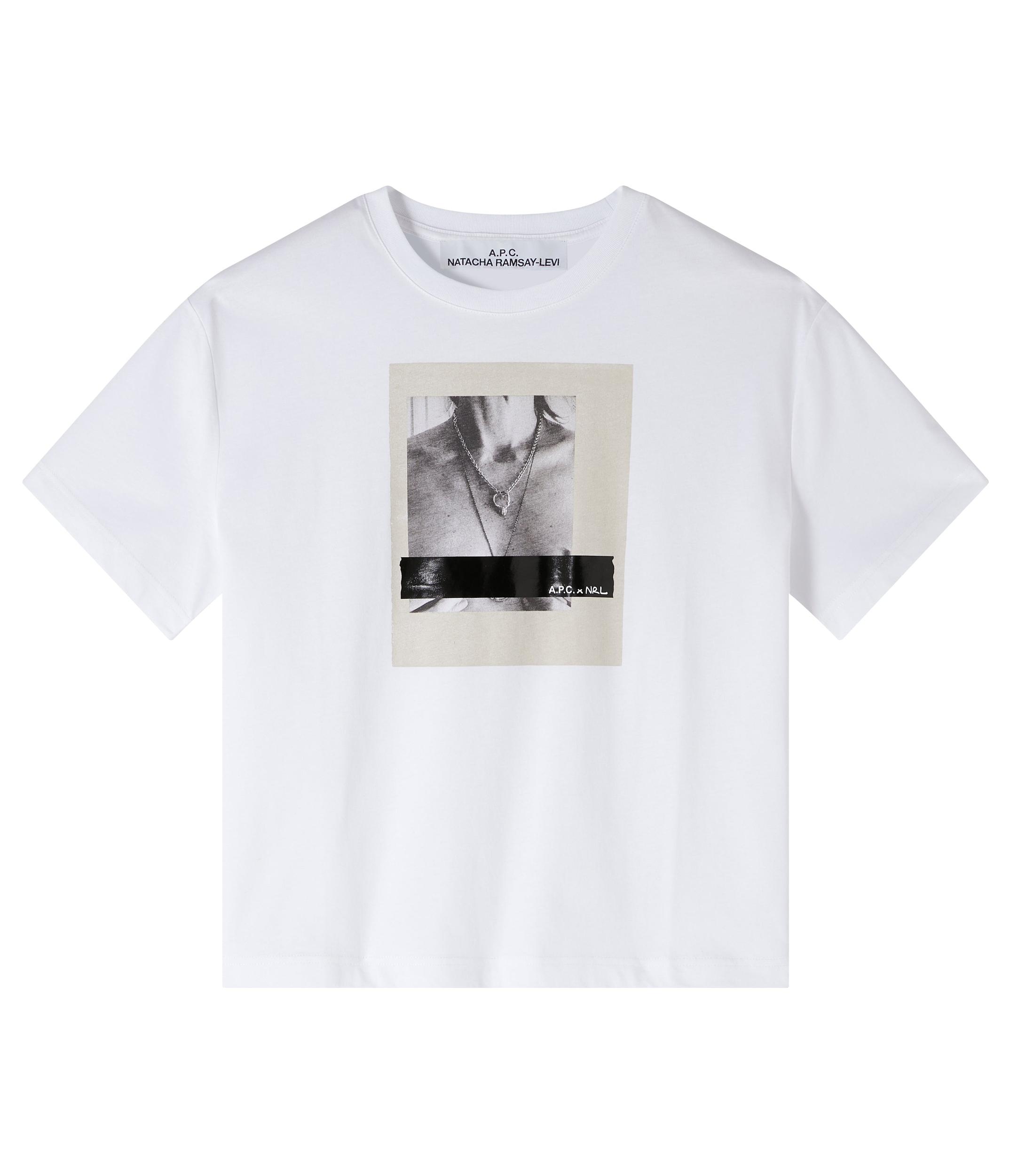 - Straight cut. - Crew neck. - Black stripe printed with 'A.P.C. x NRL' on a photo of Natacha Ramsay-Levi. - 100% cotton derived from organic farming.