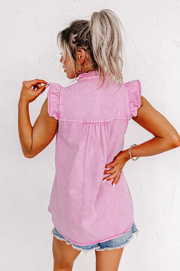 - This darling top brings the colored denim trend to the next level! - Unlined non-stretch denim - A ruffled crew neckline - A button down front - Flutter sleeves - A bodice with pleated detailing and a ruffle accent on the front - A relaxed silhouette that ends in a straight hemline