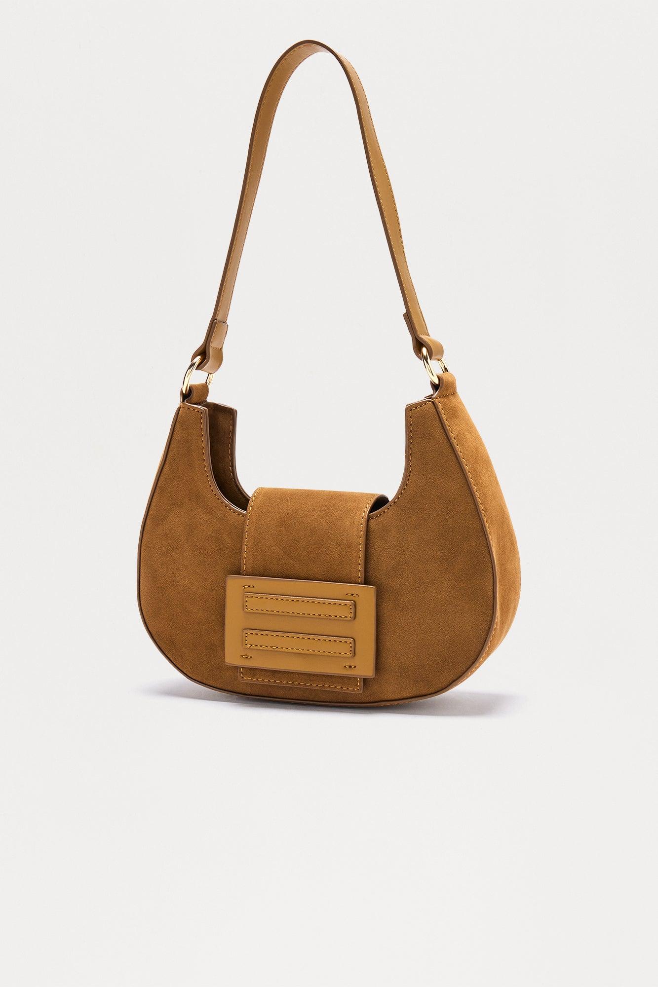 Available In Tan. Shoulder Handbag Top Zip Closure Hardware Detail Faux Suede Dimensions: 9.8*2.5*6.75" Imported California Proposition 65WARNING: Cancer and Reproductive Harm - www.P65Warnings.ca.gov.