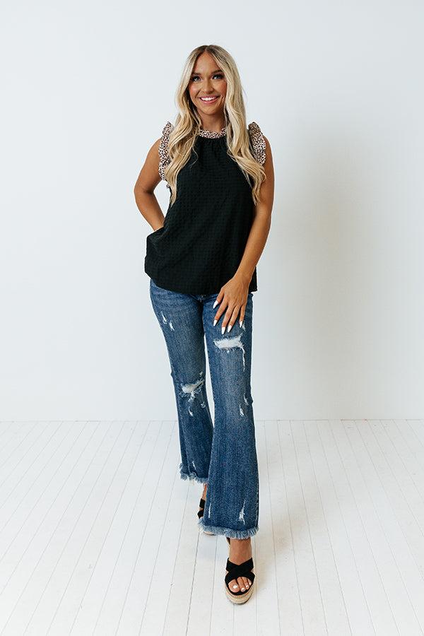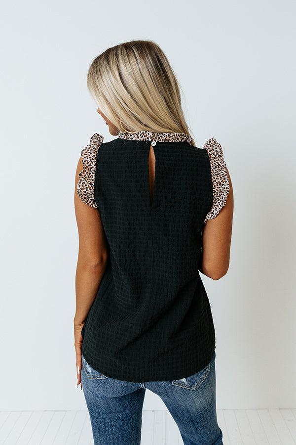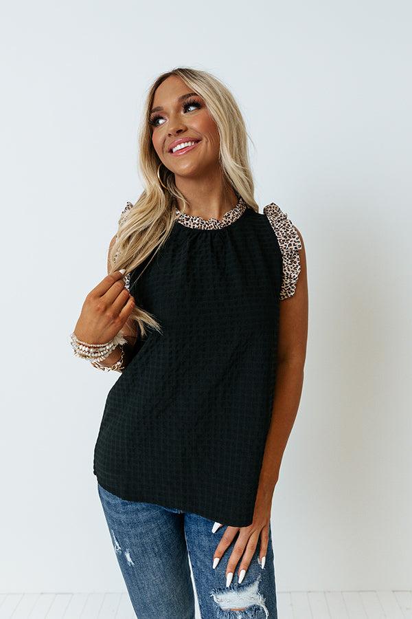 Show off your fun personality with our cute black 'New Timezone Shift Top' featuring lightweight material, ruffled leopard print cap sleeves and high neckline, a keyhole accented upper back with a button closure, and a relaxed silhouette that falls into a straight hemline! Measurements XS : Bust 34", Hip 38", Length 24", Waist 35". S : Bust 36", Hip 40", Length 24.5", Waist 37". M : Bust 38", Hip 42", Length 25", Waist 39". L : Bust 40", Hip 44", Length 25.5", Waist 41".