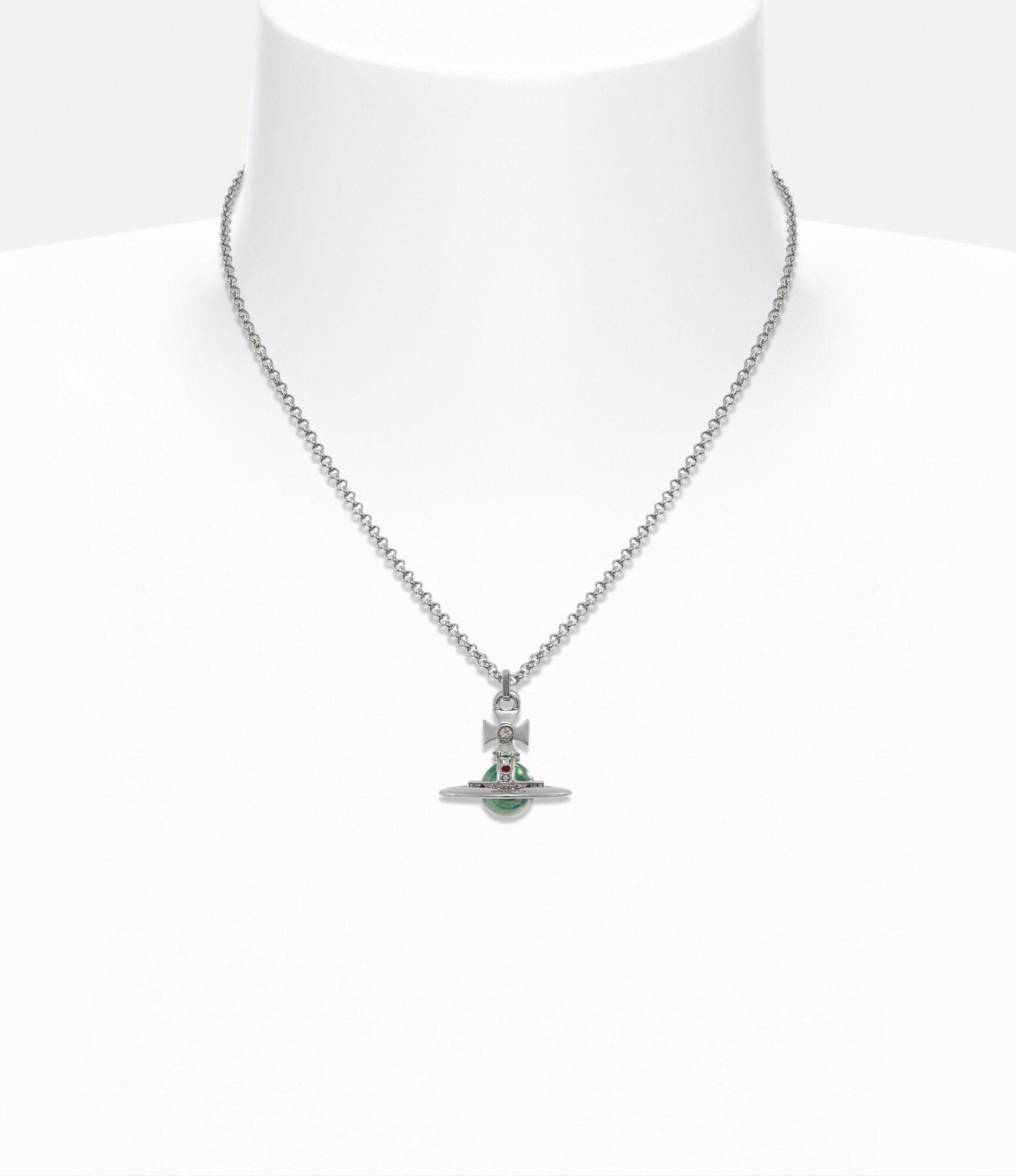 Our New Tiny Orb Pendant necklace is a signature style of the house, featuring a green spherical glass gemstone that is complemented by a secure lobster clasp. The three-dimensional orb pendant is adorned with glistening crystal details in vibrant hues, recalling the ethos of launching the past into the future.