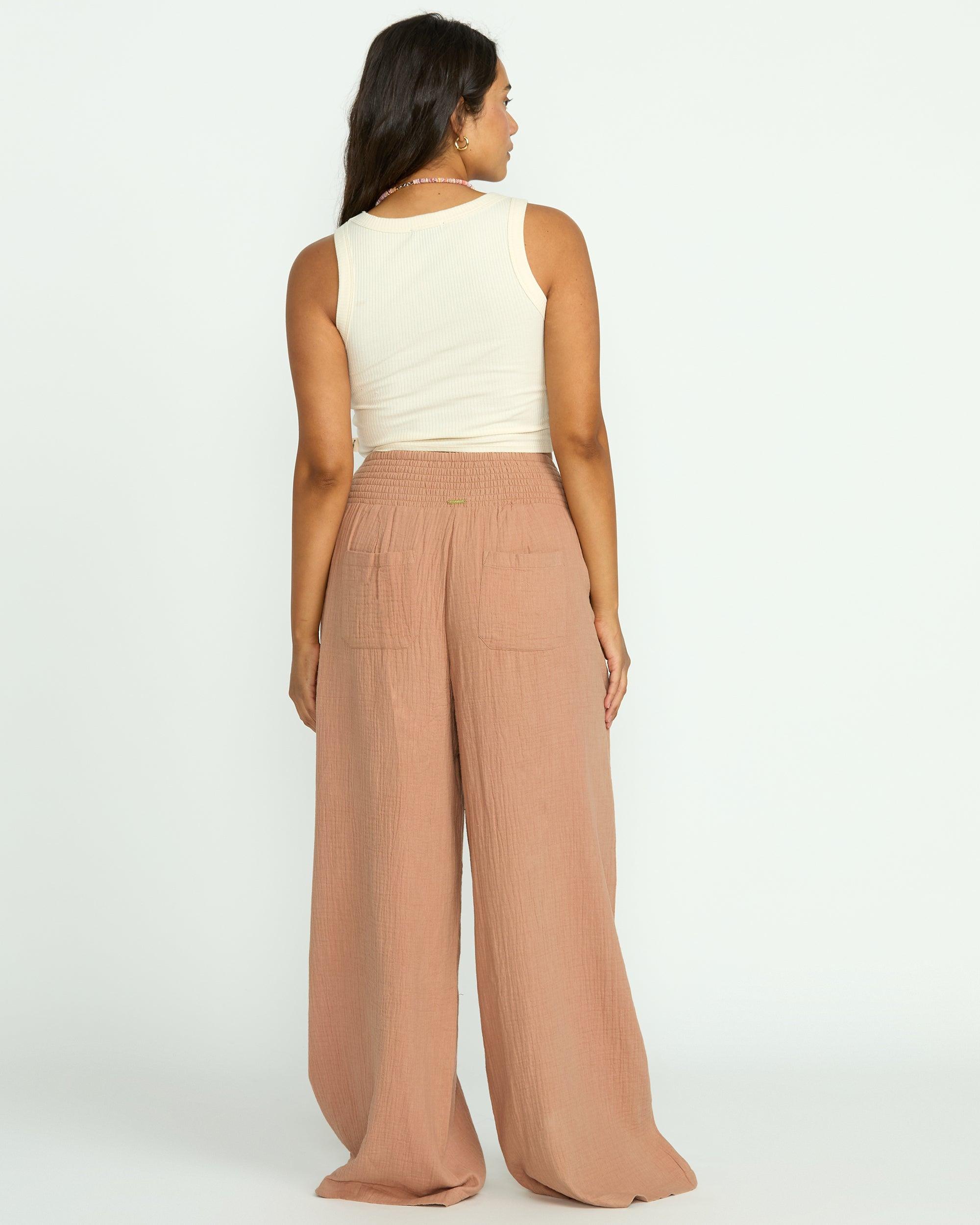Breathe easy in these soft, relaxed-fit gauze pants from Billabong Women. The 100% cotton double gauze fabric and smocked elastic waist keep you comfy while front slash pockets and back patch pockets stash your essentials. Wear them everywhere. 32" full length. Featured here in the Purple colorway. Features Full length pants 100% cotton, cotton double gauze Relaxed fit Smocked elastic waistband, Slash pockets at front, patch pockets at back, Inseam: 32" Metal plate