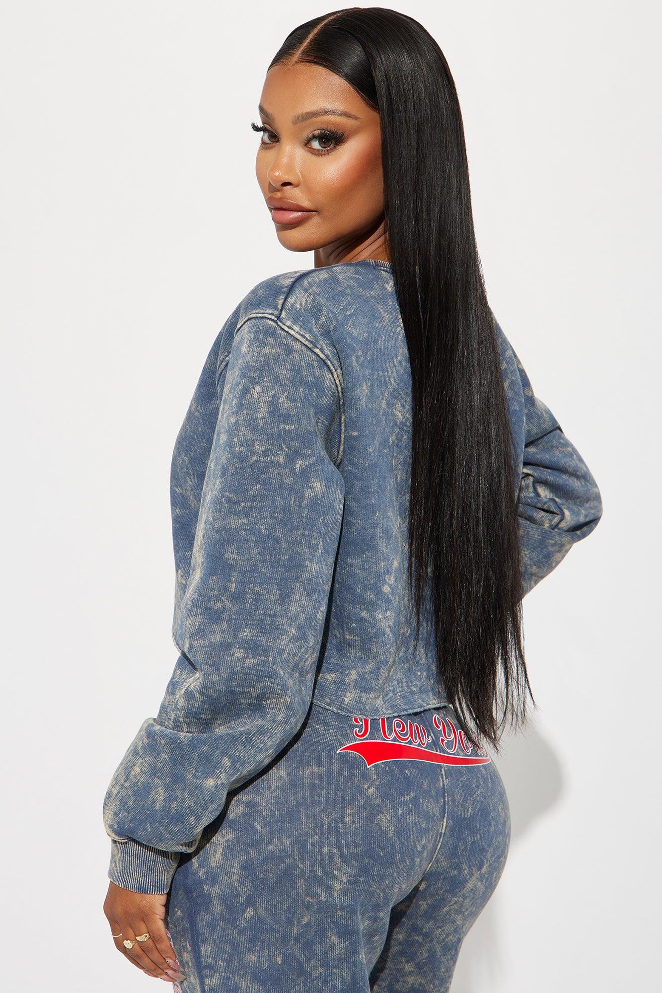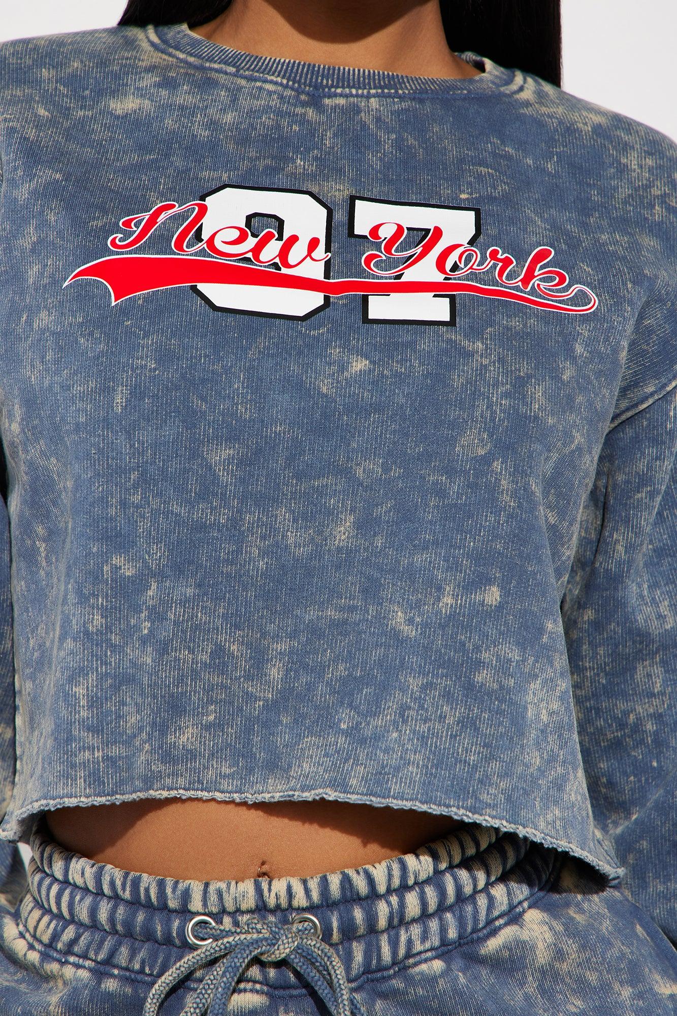 Available In Navy/combo. Sweatshirt Crew Neck Long Sleeve Front Screen Print Raw Hem Cropped Stretch Disclaimer: Due To The Specialized Wash & Printing Process A Difference In Saturation May Occur. Each Garment Is Unique. 60% Cotton 40% Polyester Imported