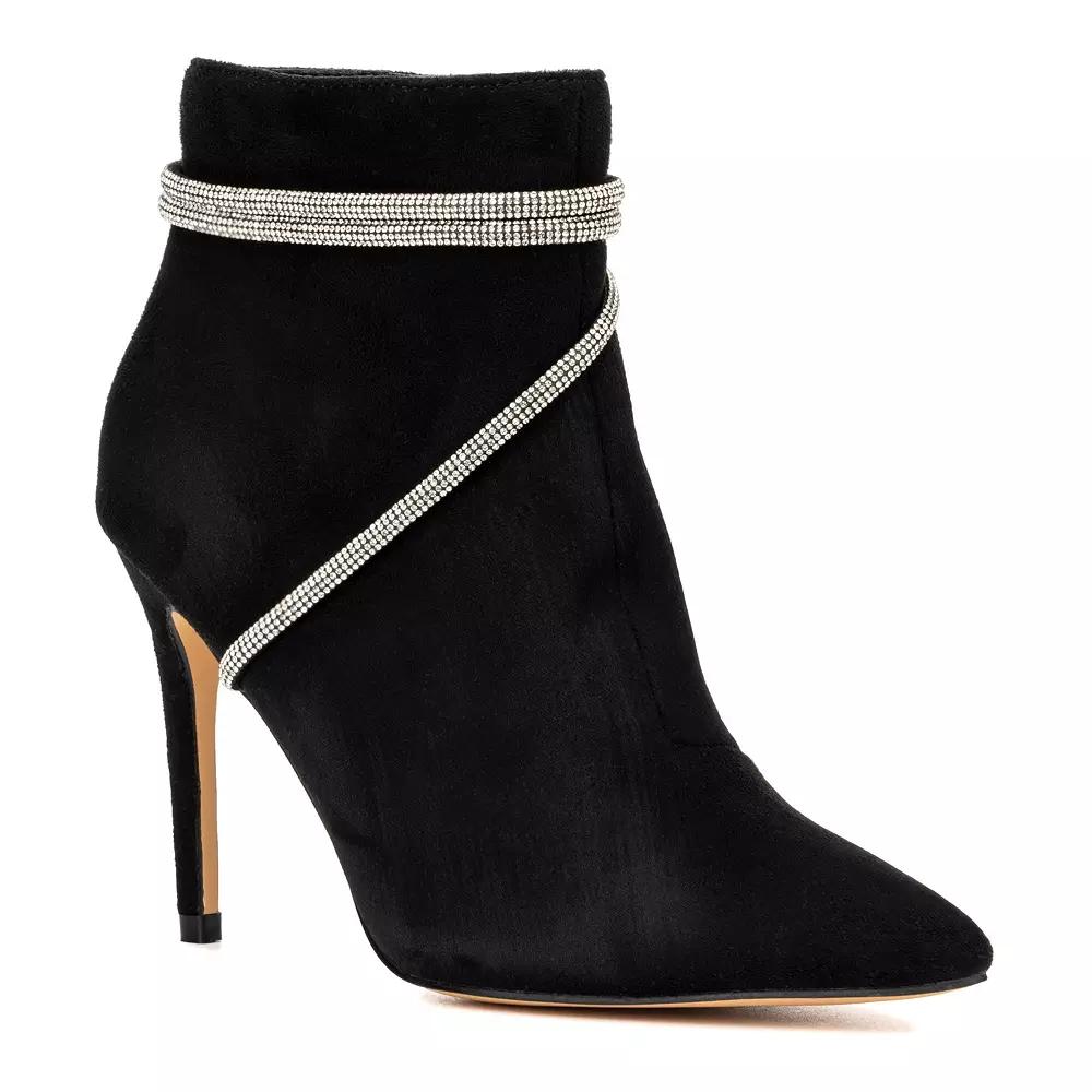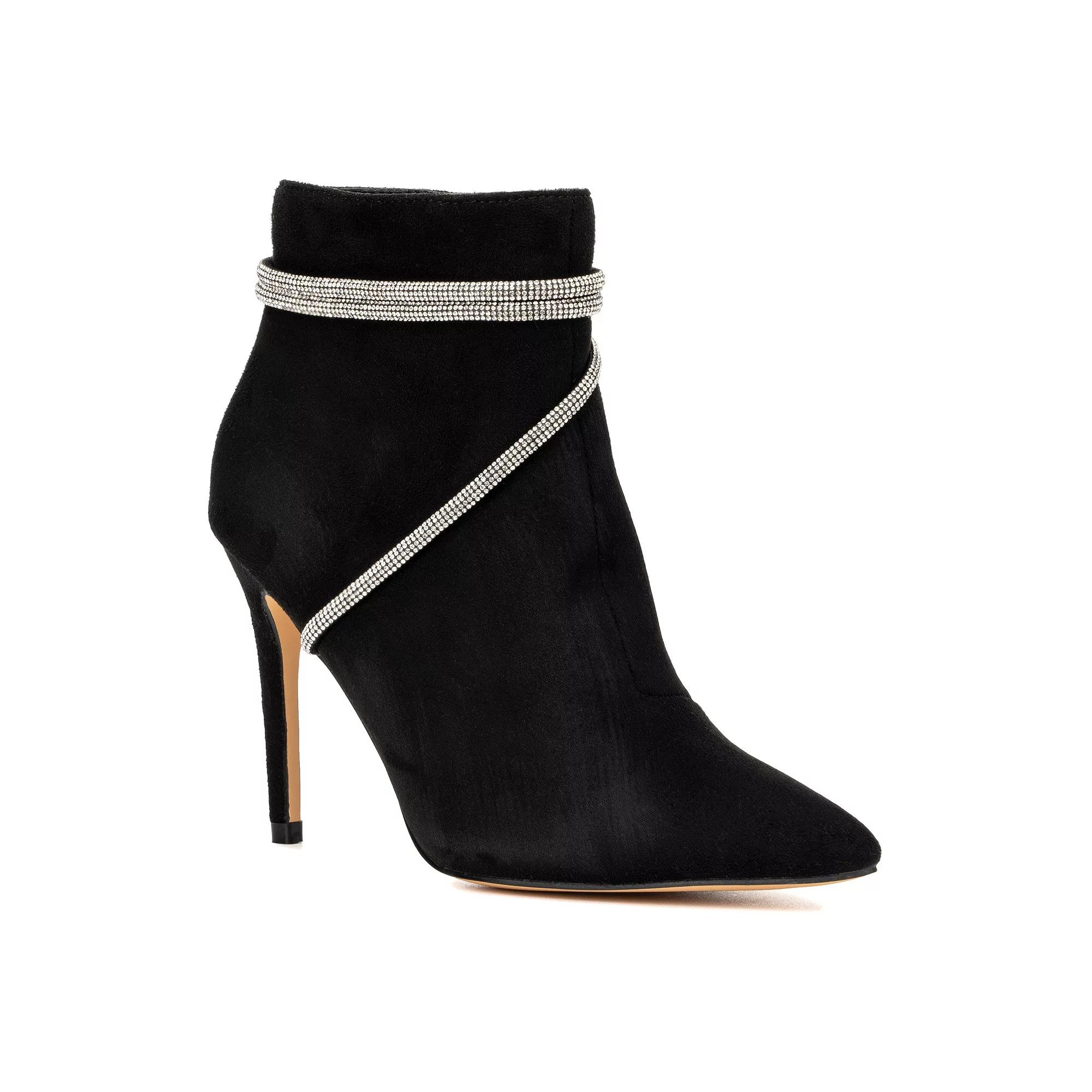 The Georgette pointed bootie has a distinguished sleek profile, stiletto heel and an ankle bracelet accent. Upper: 100% Faux Suede Outsole: 70% Rubber, 30% Textile Lining: 100% Faux Suede Heel height: 3.8" Shaft height: 4.5" Shaft circumference: 9.8" | New York & Company Women's Margaretta Bootie, Black, 6.5M