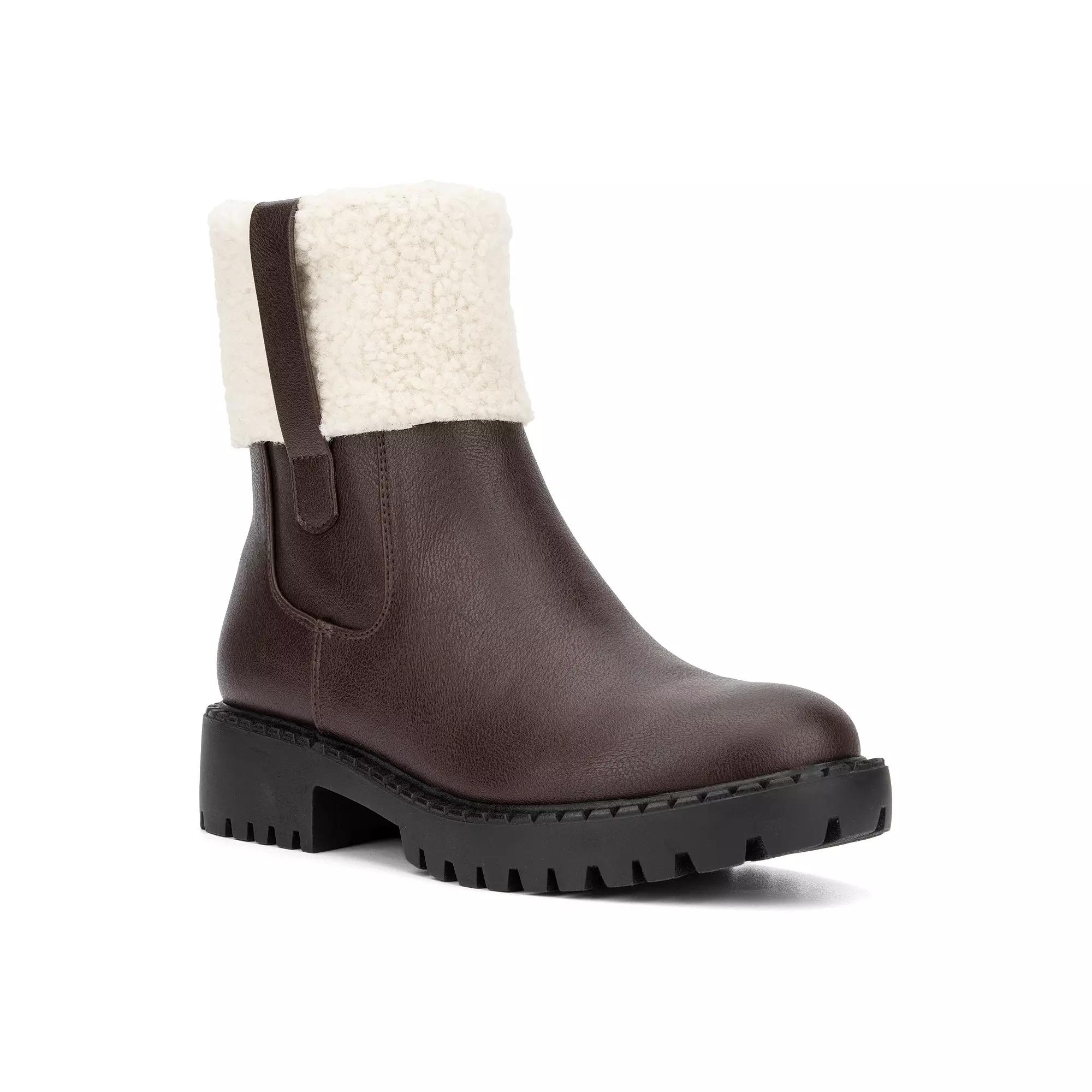 A lug sole adds reliable traction and the cuffed design adds a trendy edge to these womens New York & Company cold-weather boots. Click this FOOTWEAR GUIDE to find the perfect fit and more! A lug sole adds reliable traction and the cuffed design adds a trendy edge to these womens New York & Company cold-weather boots. Click this FOOTWEAR GUIDE to find the perfect fit and more! SHOE FEATURES Faux-sherpa cuffed design Side zipper closure for easy on and offSHOE CONSTRUCTION Faux-leather, faux-sherpa upper Fabric lining Rubber outsoleSHOE DETAILS Round toe Zipper closure 1.57-in. lug heel 6.29-in. shaft 11.6-in. circumference Spot clean Imported Size: 7.5. Color: Brown. Gender: female. Age Group: adult.