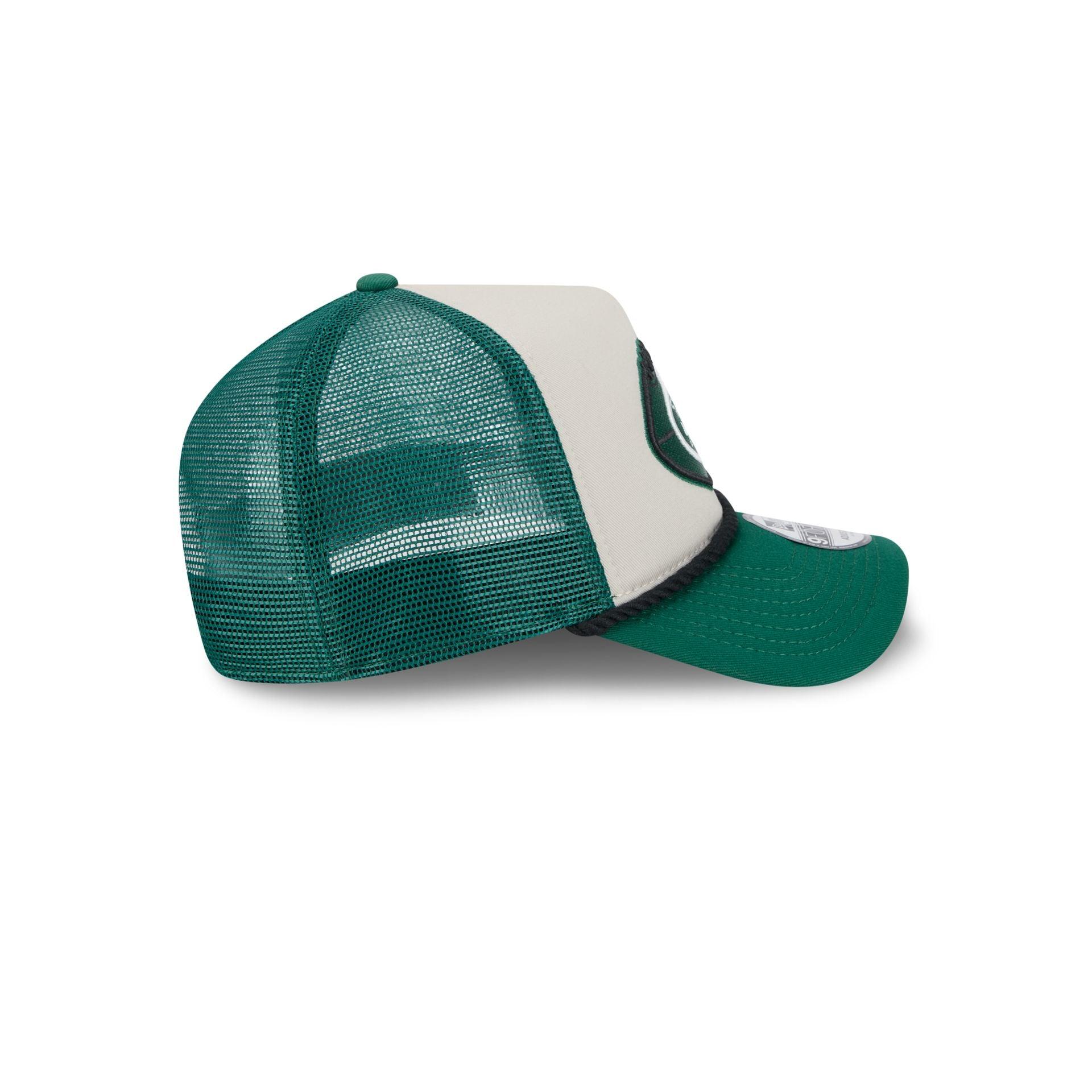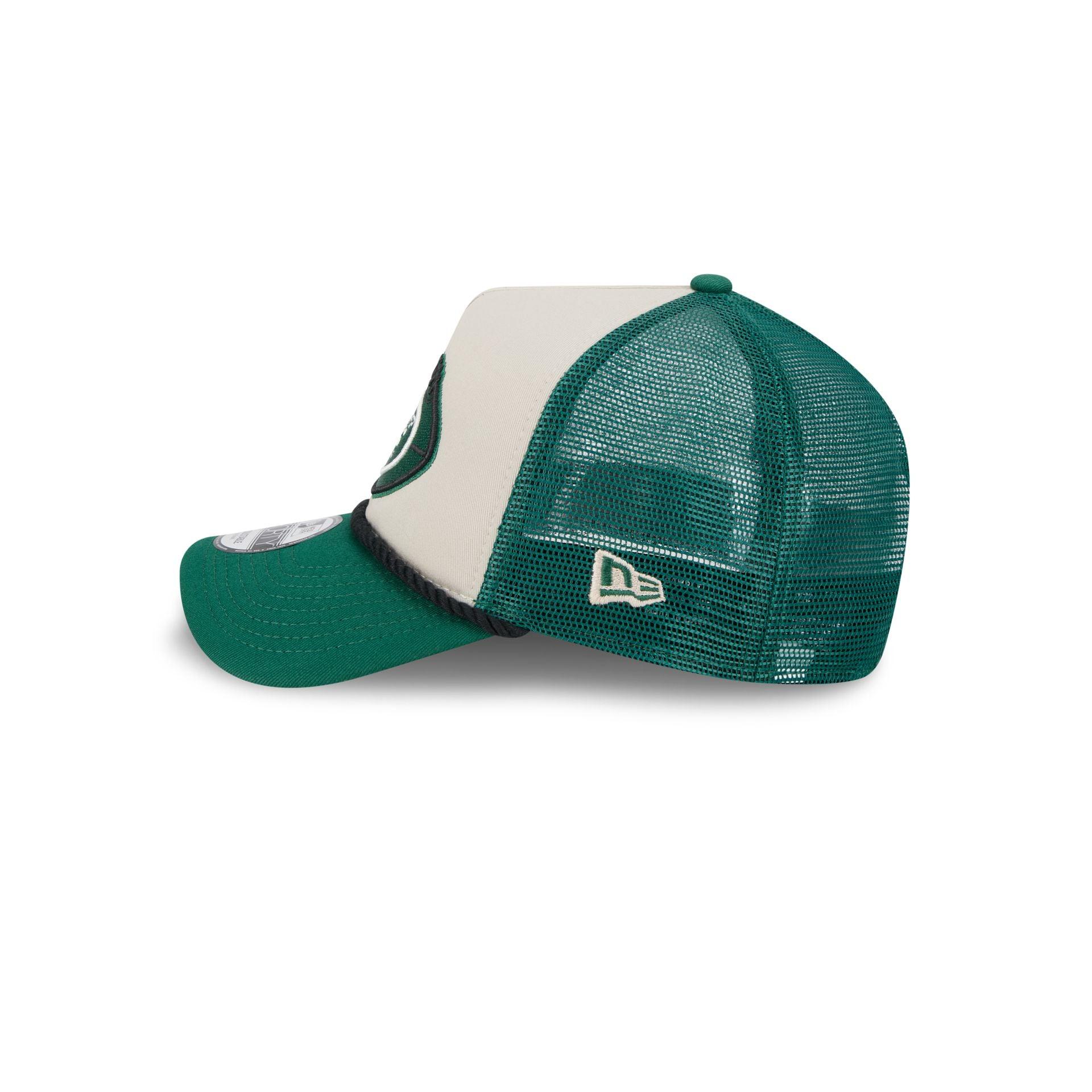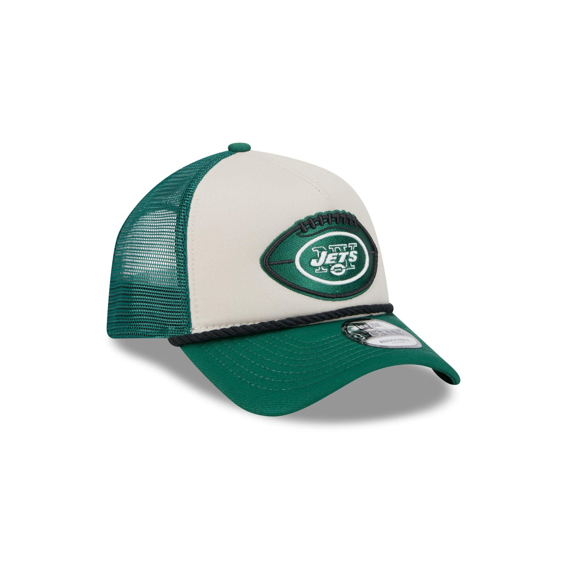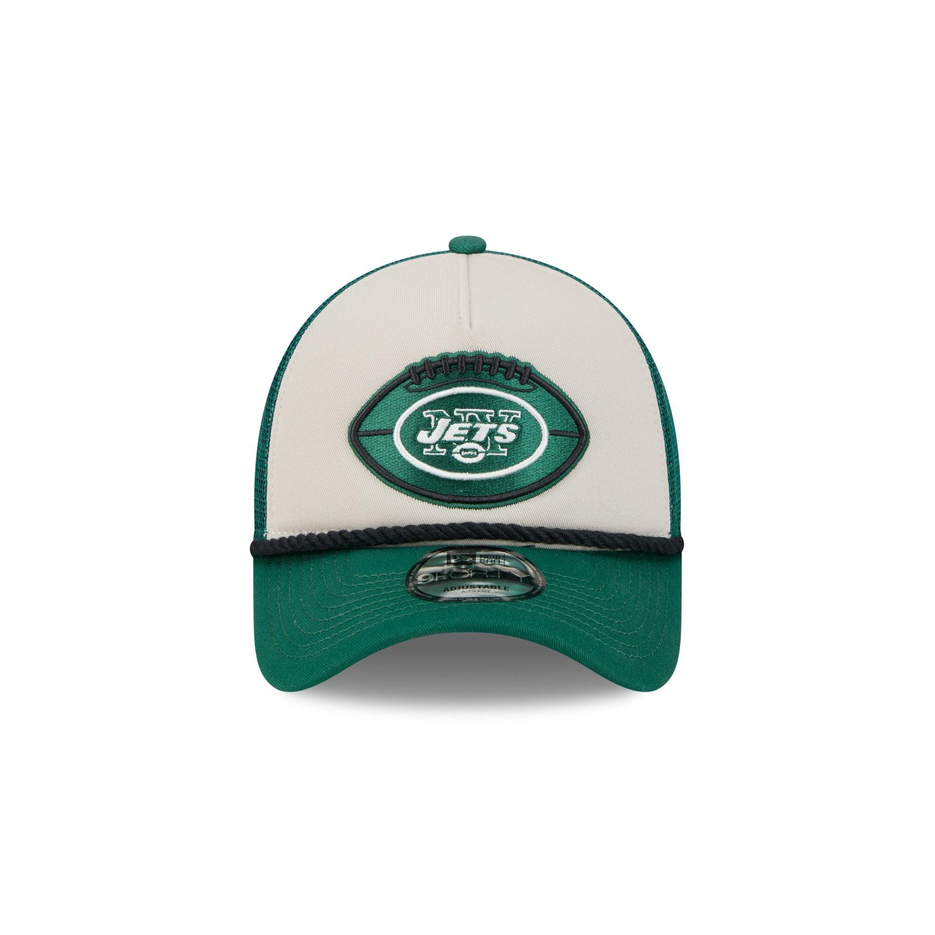 The New York Jets 2024 Historic Sideline 9FORTY A-Frame features an embroidered Jets Historic logo at the front panels with a matching NFL Shield above a snapback closure at the rear.