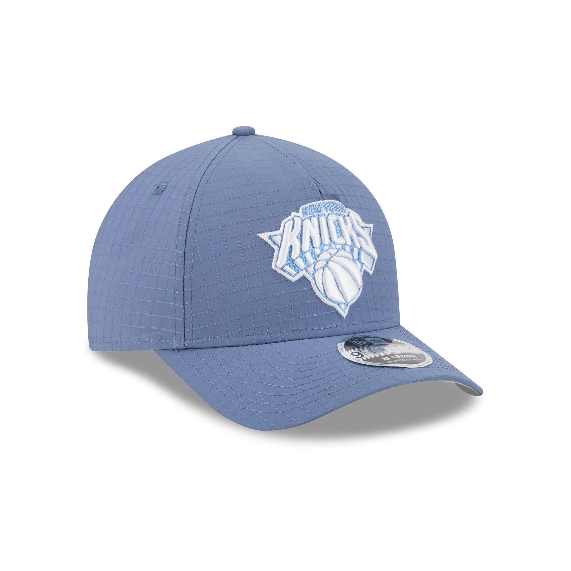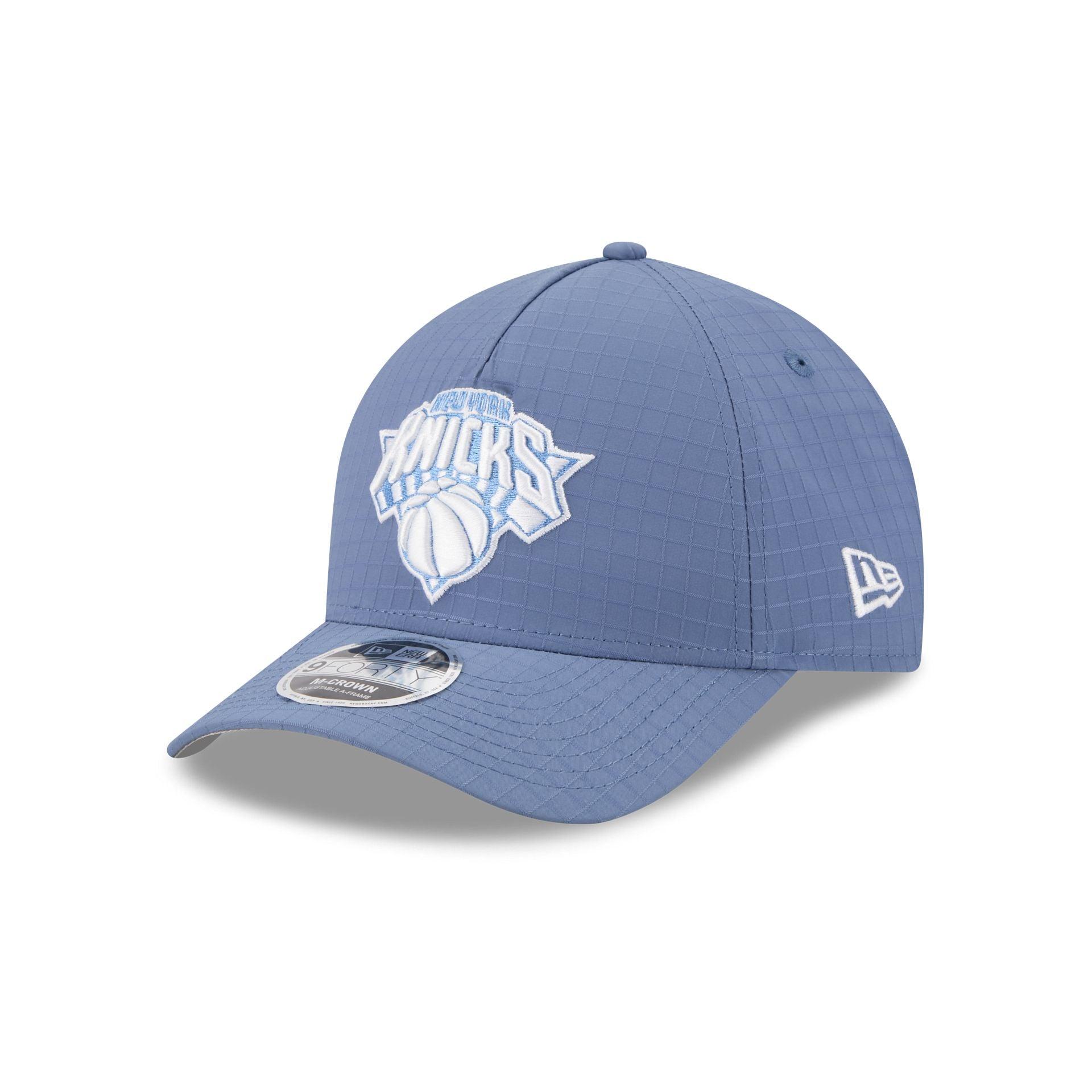The New York Knicks Blue Ripstop 9FORTY M-Crown A-Frame Snapback features an embroidered Knicks logo at the front panels against a nylon ripstop fabrication throughout the cap. Additional details include an adjustable snapback closure at the rear and a gray undervisor.
