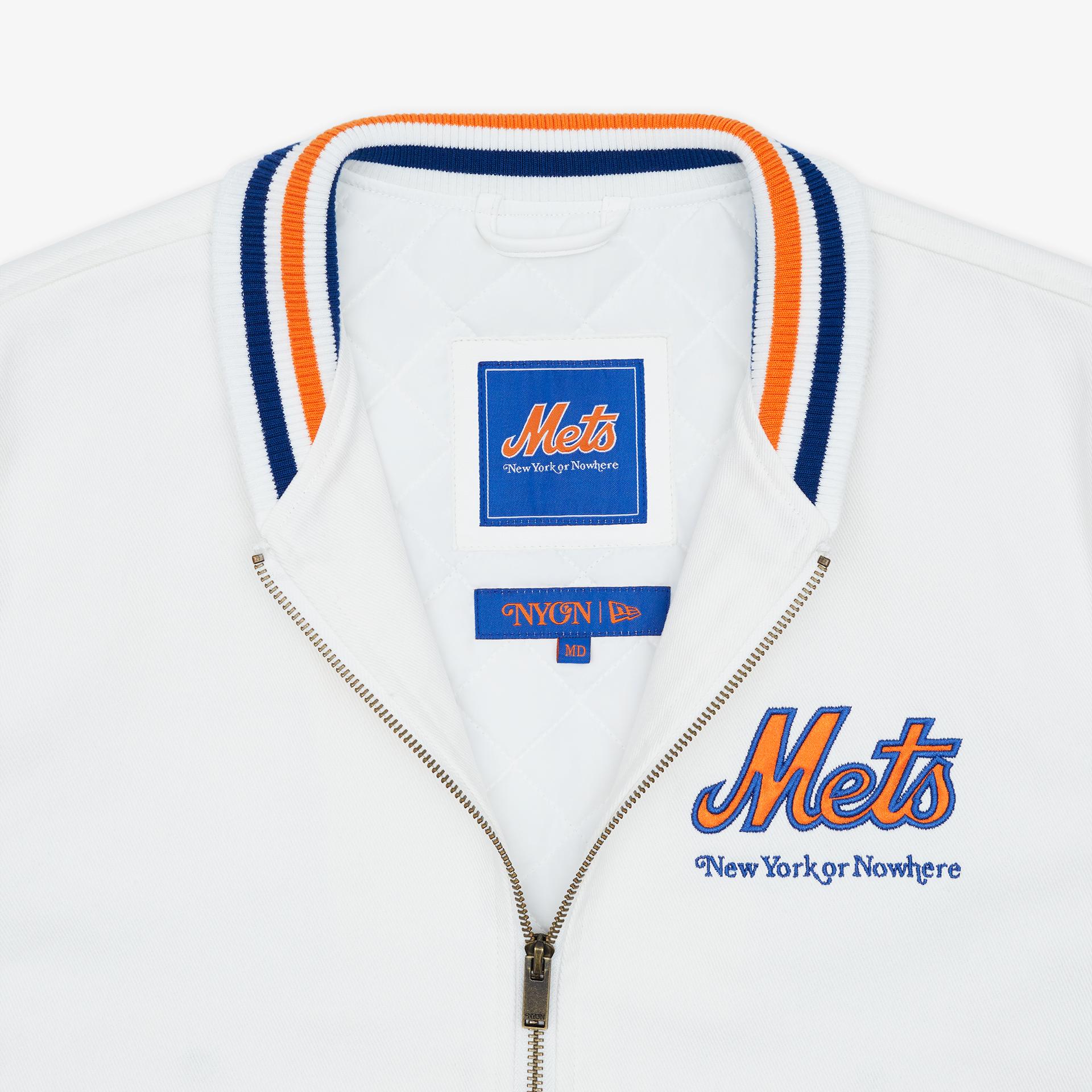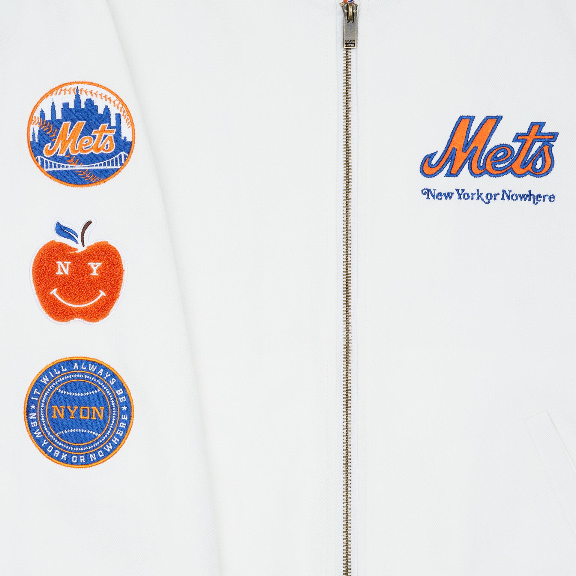 The New York or Nowhere x New York Mets White Jacket features an embroidered satin applique Mets logo above a New York or Nowhere wordmark at the left chest with a matching logo and wordmark at the rear. Additional details include New York or Nowhere patch, alternate Mets logos, and an MLB Batterman logo at the right sleeve with a woven Mets x NYON tag at the left wrist. This jacket has a zipper closure.Fabric: 80% Cotton, 20% Polyester