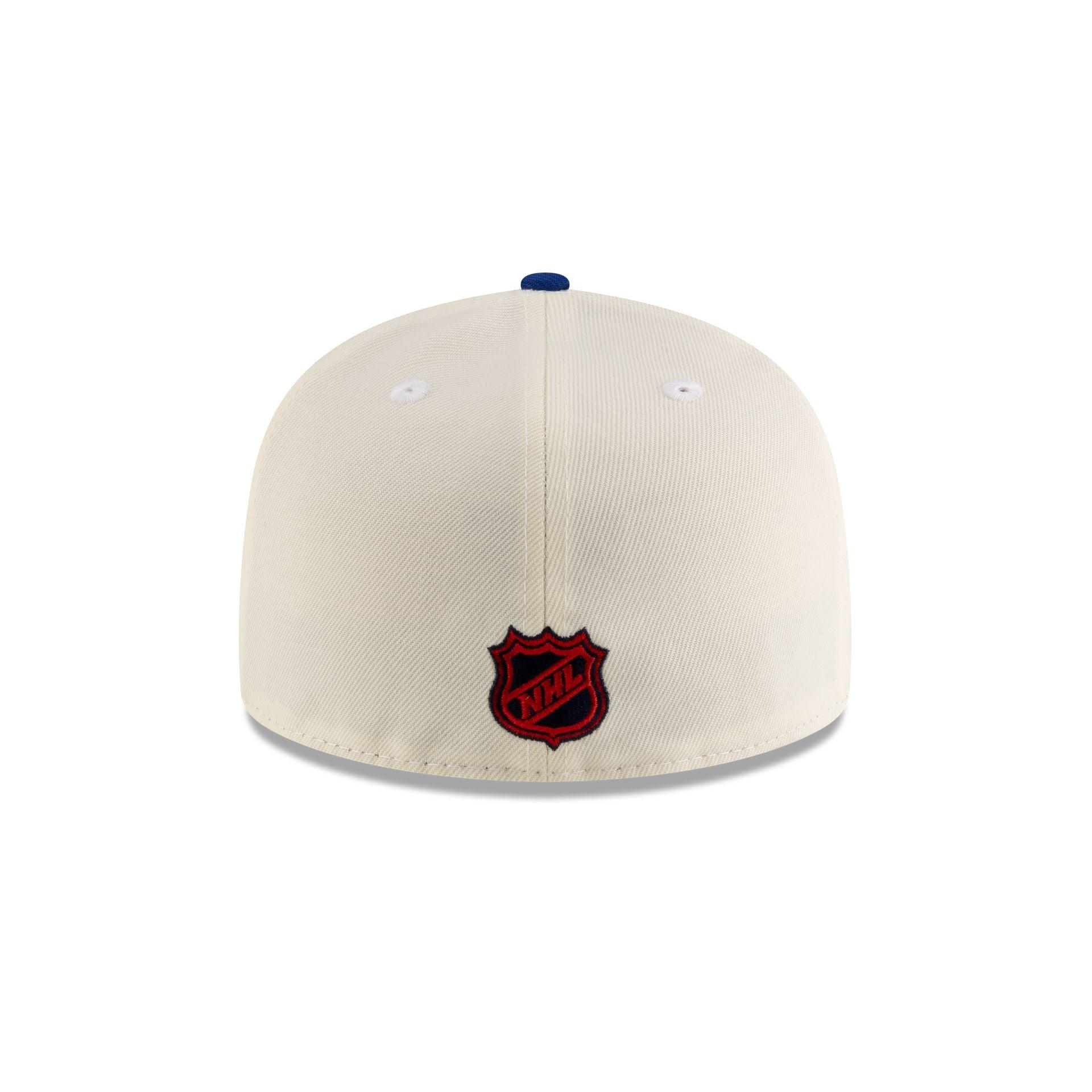 The New York Rangers Chrome Royal 59FIFTY Fitted Cap features an embroidered Rangers logo at the front panels with a matching NHL Shield at the rear. Additional details include a 2012 Winter Classic patch at the right-wear side and a green undervisor.