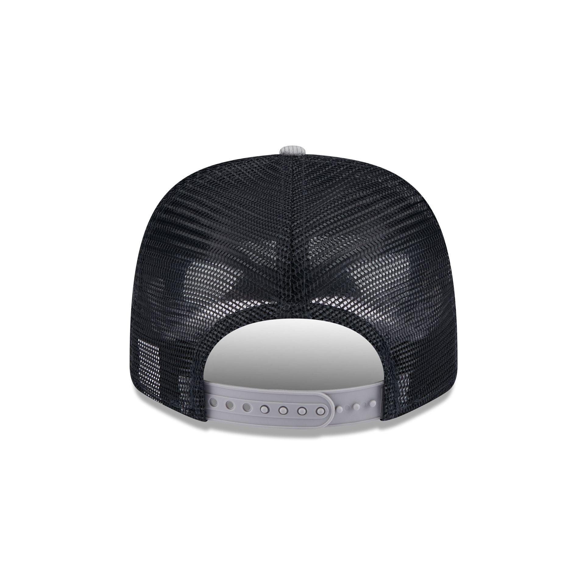 The New York Yankees 2025 Batting Practice Gray 9SEVENTY Trucker features an embroidered Yankees logo at the front panels with a snapback closure at a mesh rear and a gray undervisor.