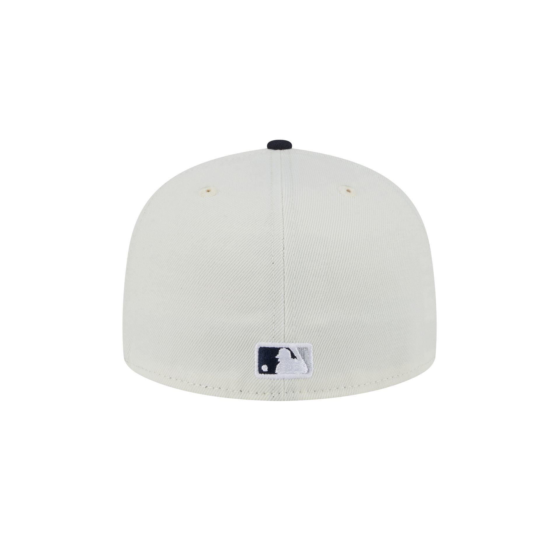 The New York Yankees Aaron Judge Chrome White 59FIFTY Fitted Cap features an embroidered Yankees logo at the right panel and the player's signature and number at the right. Additional details include an MLB Batterman logo at the rear and a gray undervisor.
