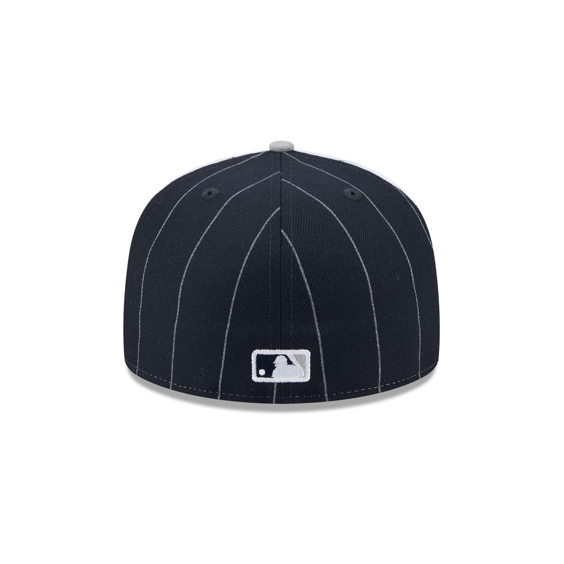 The New York Yankees Pinstripe League Pin 59FIFTY Fitted Cap features an embroidered Yankees logo at the front panels with a League pin at the front right panel. Additional details include pinstripes, a matching MLB Batterman logo at the rear, and a gray undervisor.