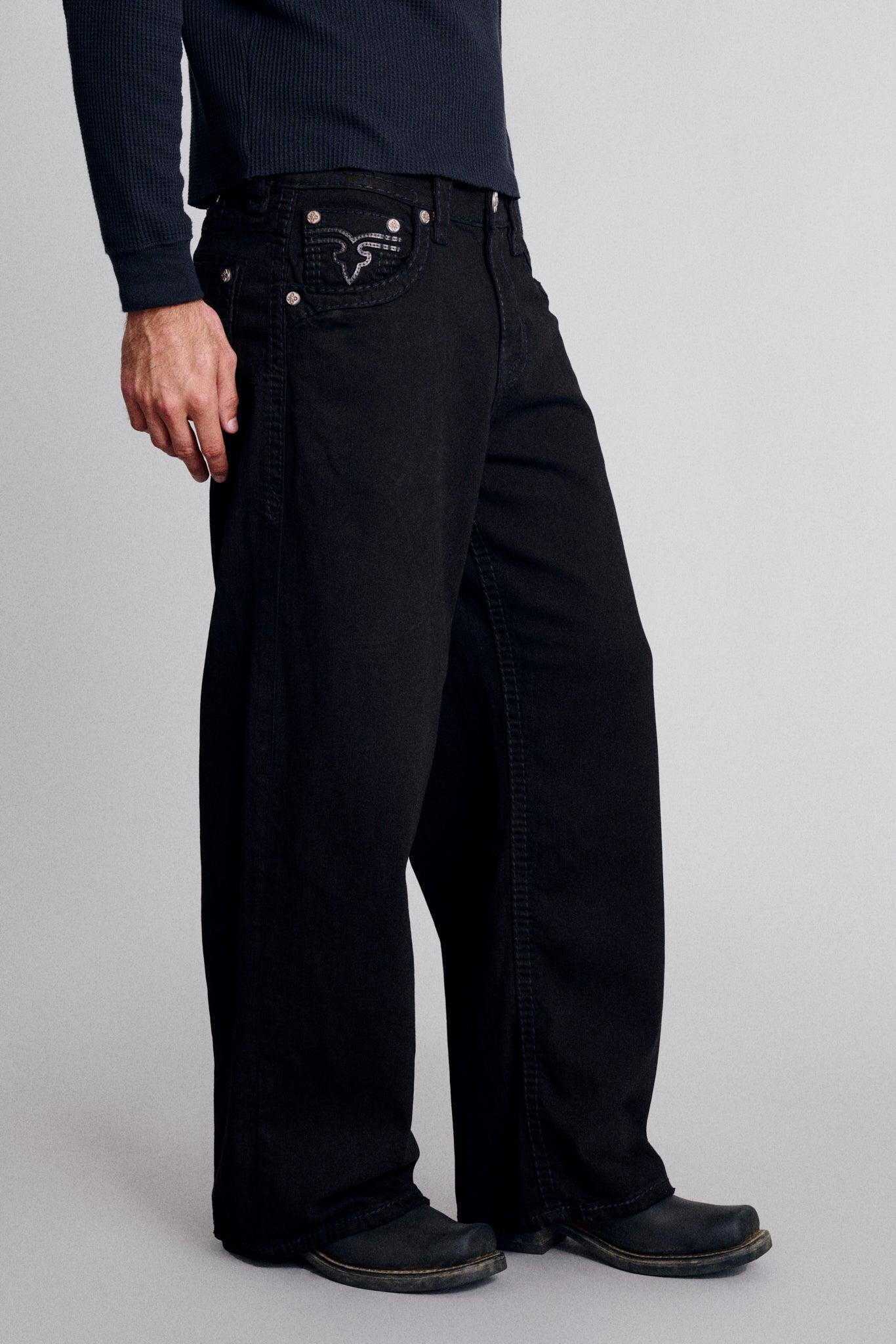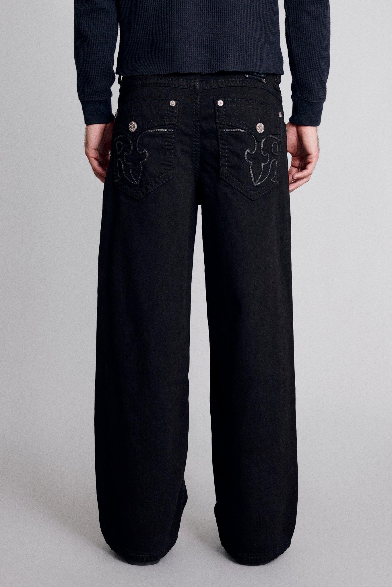 Newton Baggy Jeans by Rock Revival with a baggy silhouette crafted in a black wash, designed in Los Angeles. Premium stretch denim for comfort and durability Signature inverted Fleur-de-Lis embroidery Custom pewter hardware and rivets Engraved 'Rock Revival' leather waist patch Designed as a unisex fit Model is 6'2" and wearing a size 32 34” waist with a 24” leg opening, and 31” inseam for a relaxed, oversized fit Fit Note: Fits true to size for a relaxed, baggy look. Size up for an extra-oversized fit.