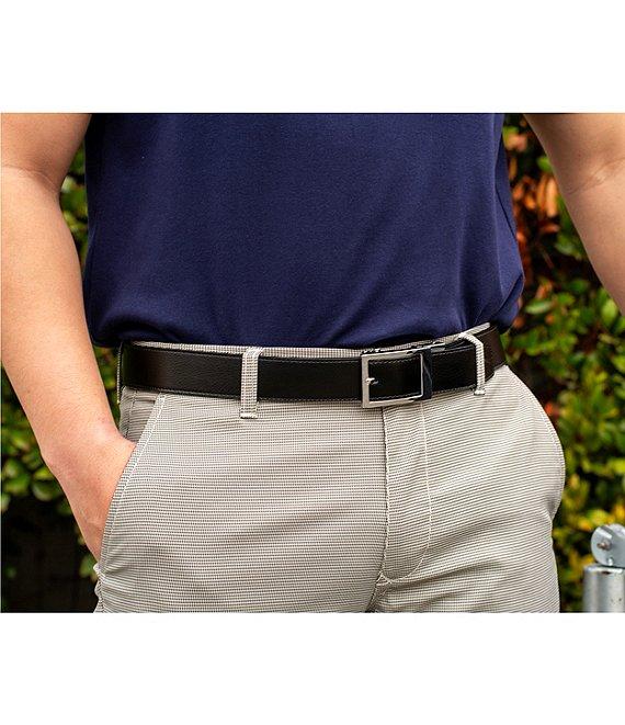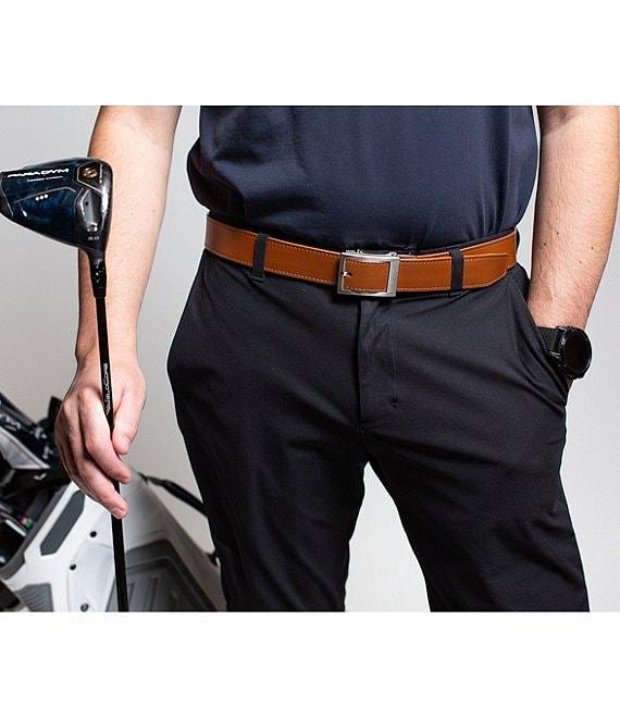 From Nexbelt, this belt features: Lightly weathered PreciseFit™ ratchet technology Fits up to 45" waist Looks like a traditional dress belt but has all the convenience of our PreciseFit™ Technology Buckle has a chrome finish Buckle size 1 5/8" x 2 5/16" – Belt strap width is 1 3/8" Leather Spot clean with a damp cloth Imported.