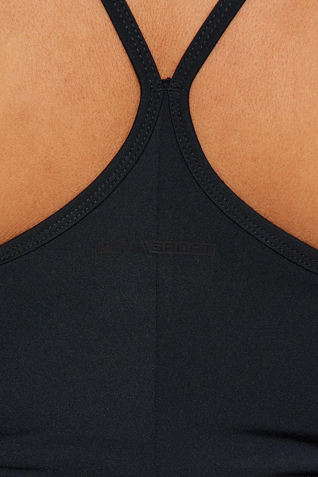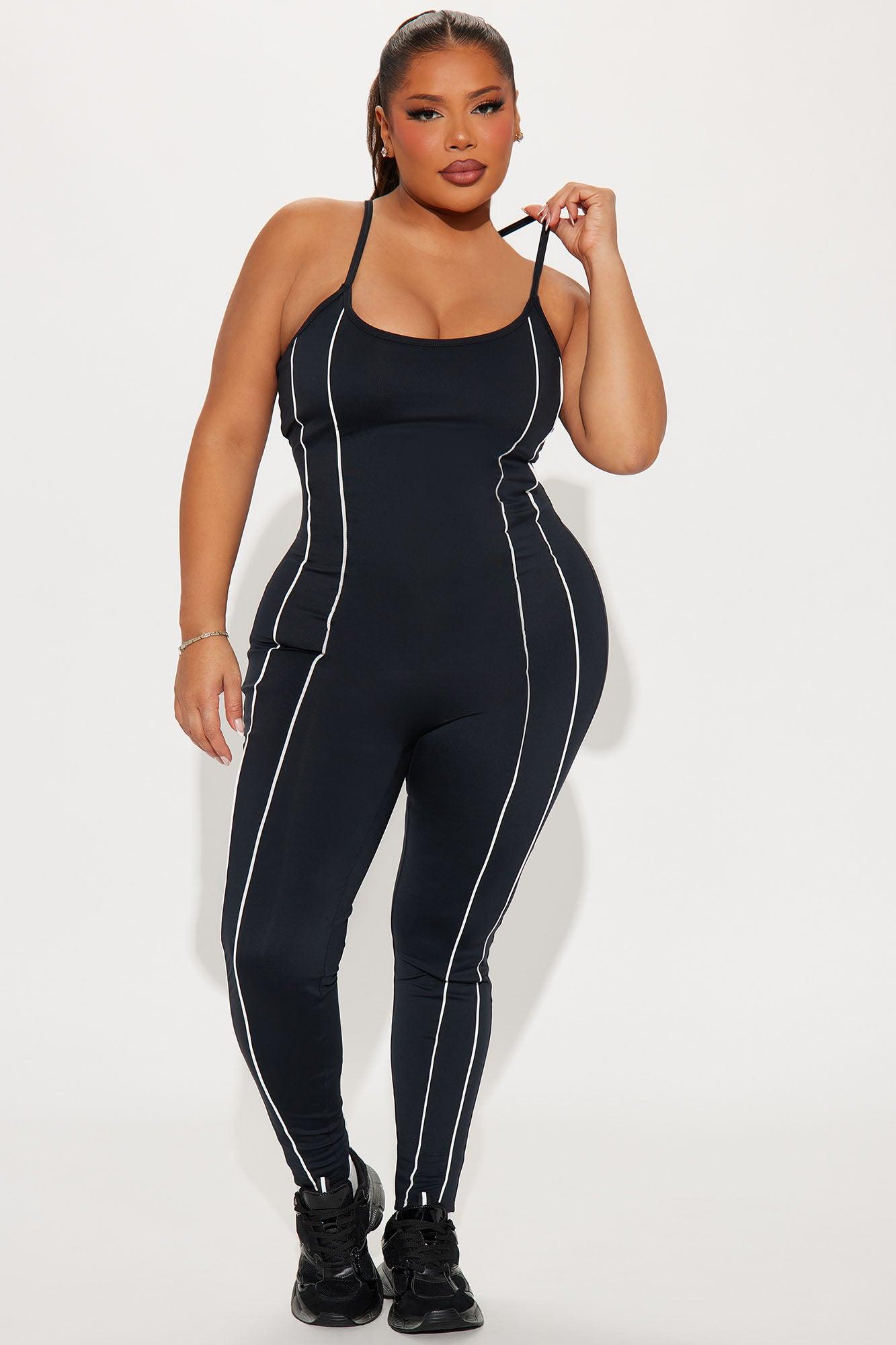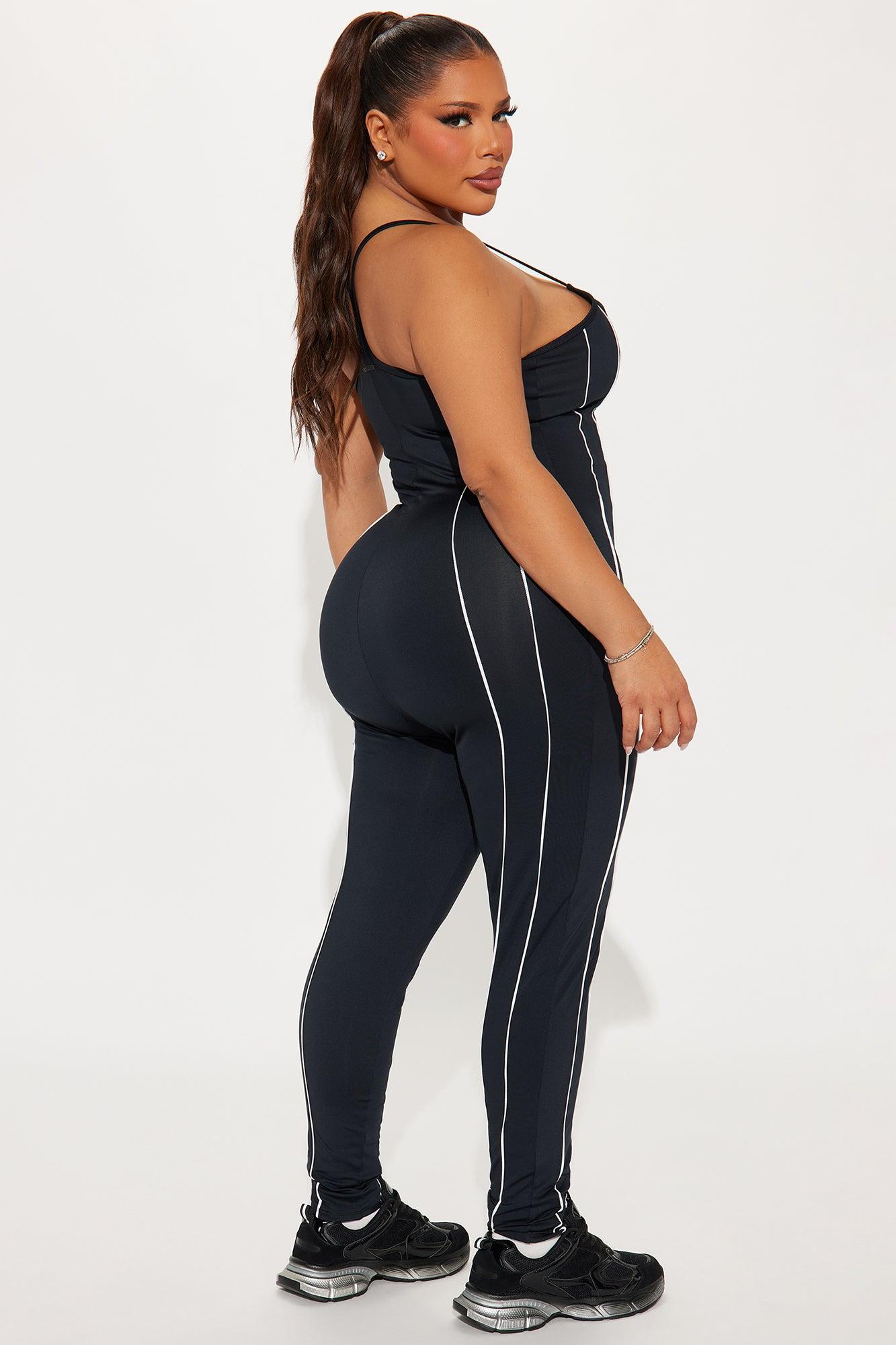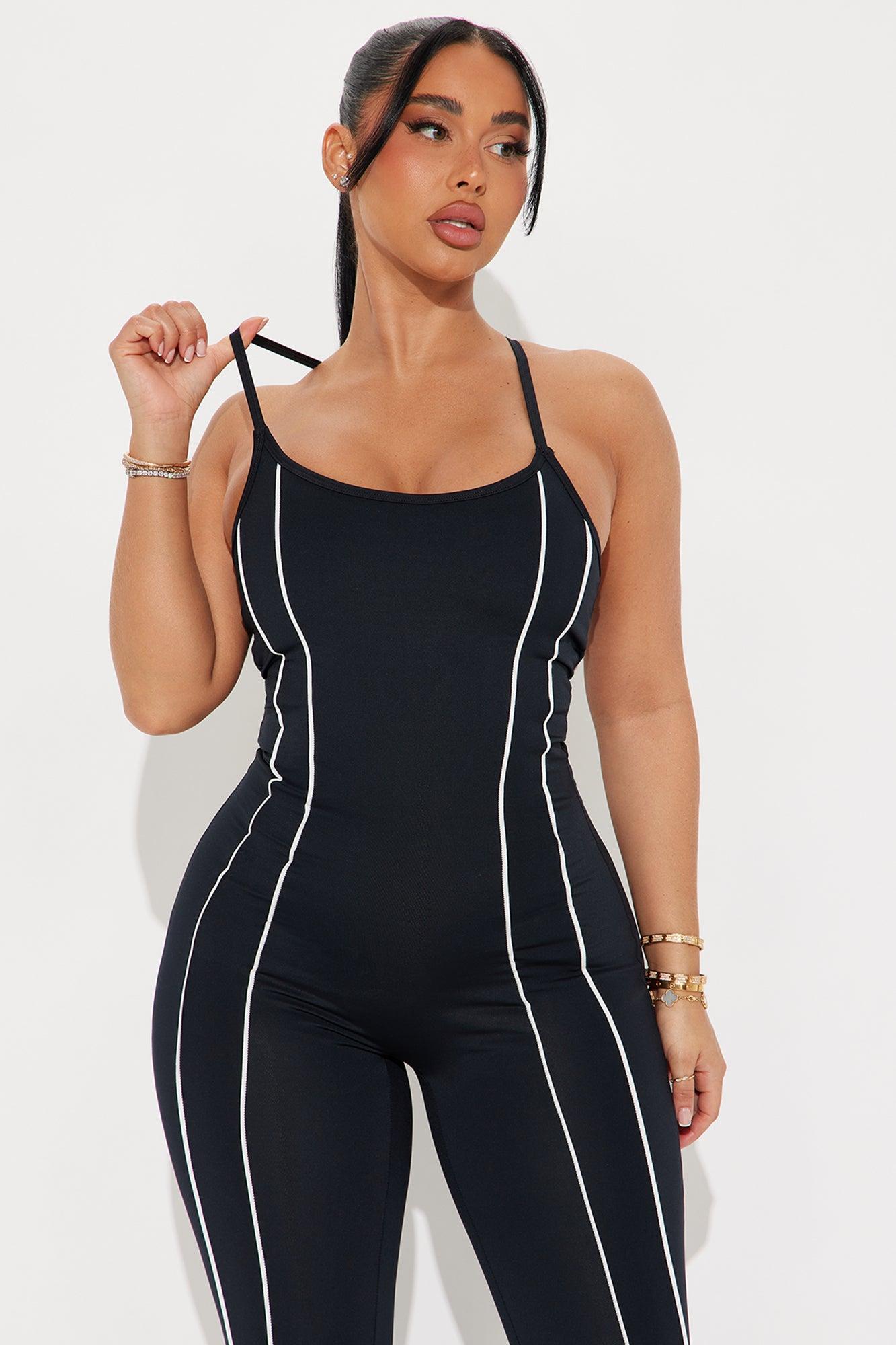 Available In Black And CobaltBlue. Active Jumpsuit Square Neck Sleeveless Elevate Contrast Trim High Impact Stretch Body: 73% Polyester 27% Spandex Inner Mesh: 82% Nylon 18% Spandex Imported